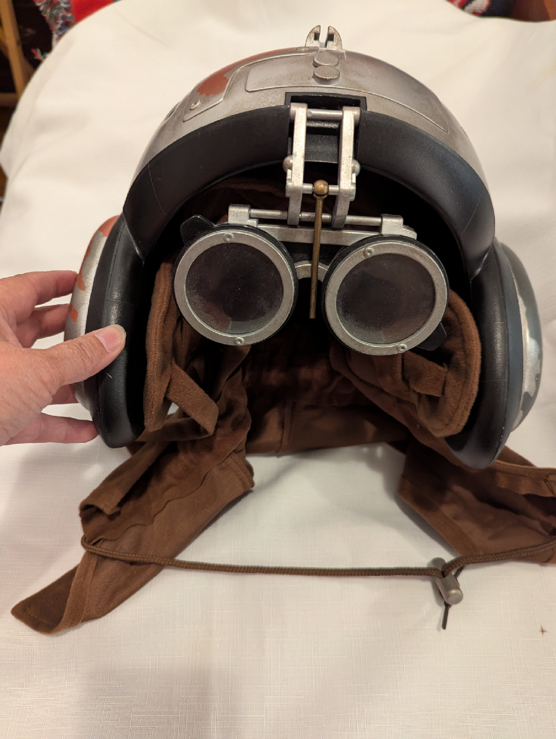 Teen or adult sized pod racing helmet. You could build a whole costume around this! Very detailed. Goggles are attached and lift up. This is a weighty item so be prepared. Feel the force guide you through your pod race. Very cool item made by Lucas Film It has a cool, weathered look with goggles and ear coverings. Perfect for costumes or display.