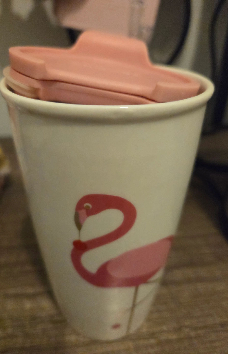DAVIDsTEA travel mug featuring a fun flamingo design! It comes with a pink lid. Perfect for keeping your tea warm on the go