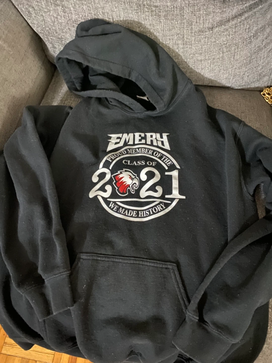 It has a print that says "Emery, Proud member of the class of 2021, We made history".