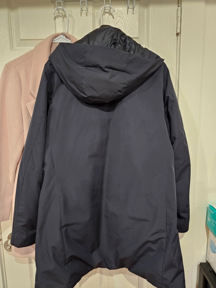The coat is a stylish navy blue colour and features a hood for extra protection from the elements. The lining is quilted for added warmth and comfort. water resistant.