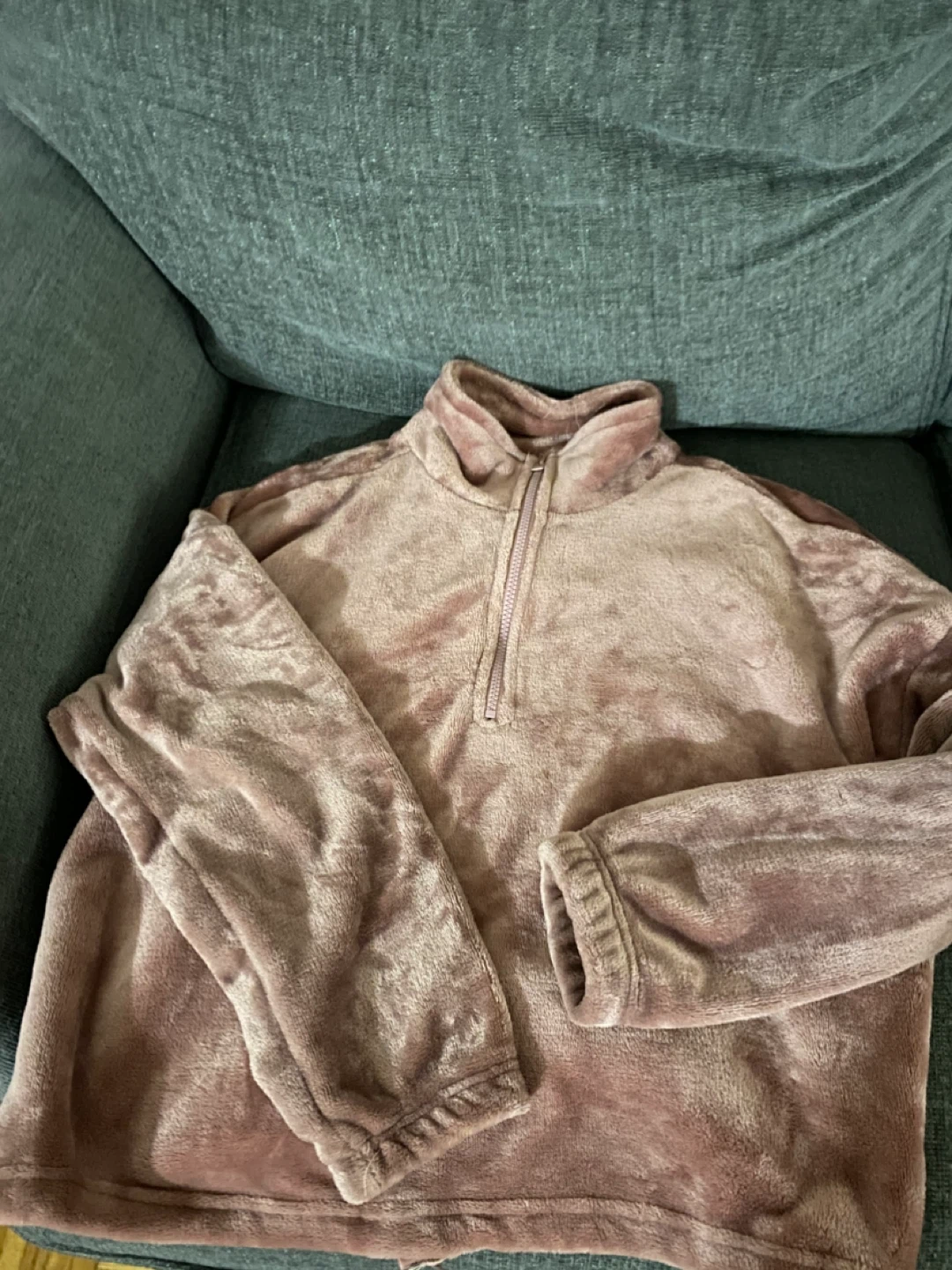 It's a size L and features a quarter-zip design. Perfect for layering or just lounging around the house
