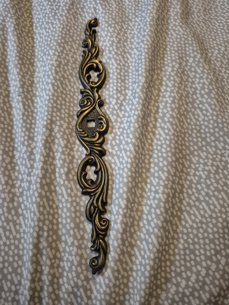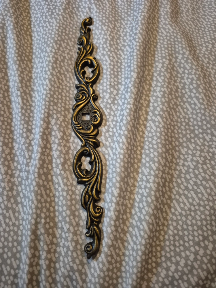 Selling a beautiful ornate bronze drawer pull. It has a lovely detailed design with a square opening in the centre. Perfect for adding a touch of elegance to any furniture piece