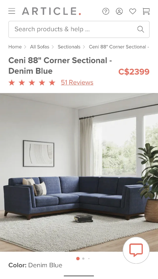 60NEW half section I box of an Article Ceni 88" corner sectional in denim blue! This stylish sectional will add a touch of elegance to your living room. Originally bought for C$2399. The box is included. This is BOX 1 OF 2.