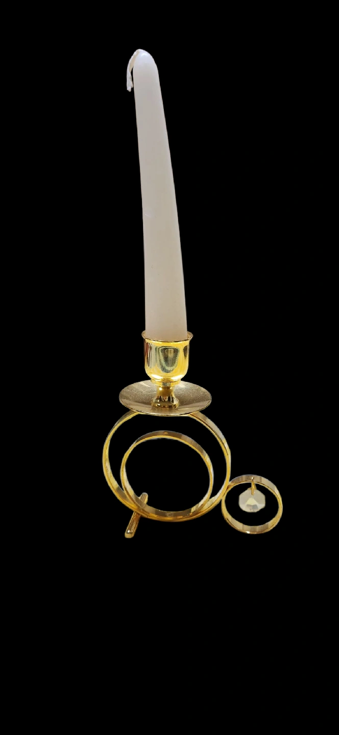 Selling a gold-coloured candle holder with a white candle. It has a unique, decorative design with circular elements and a small hanging crystal-like accent. Perfect for adding a touch of elegance to any room!