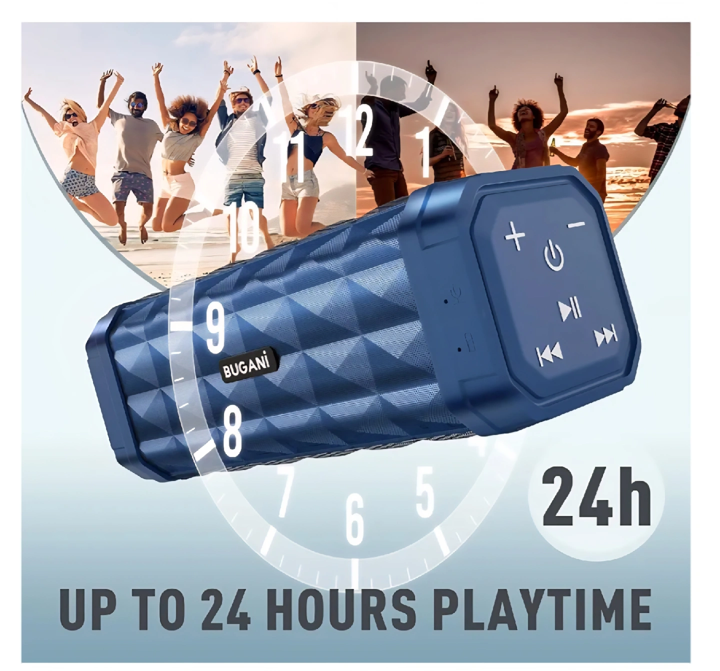 BUGANI Bluetooth Speaker M99 Speaker Bluetooth Wireless, Louder Volume, Stereo Sound, 24H Playtime, 100ft Wireless Range, IPX5 Waterproof, Built-in Mic, Portable Speaker for Home, Outdoor, Blue in color, brand new only box open for inspection never used.