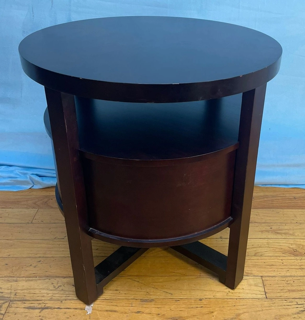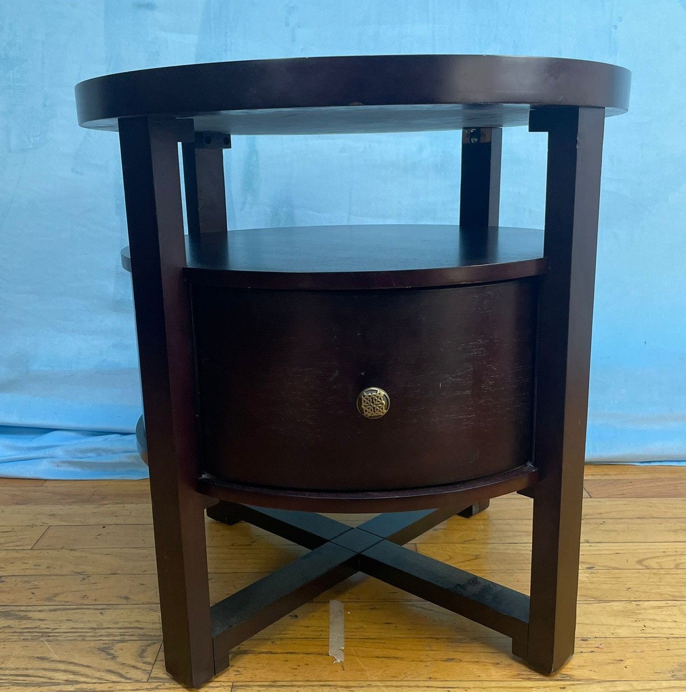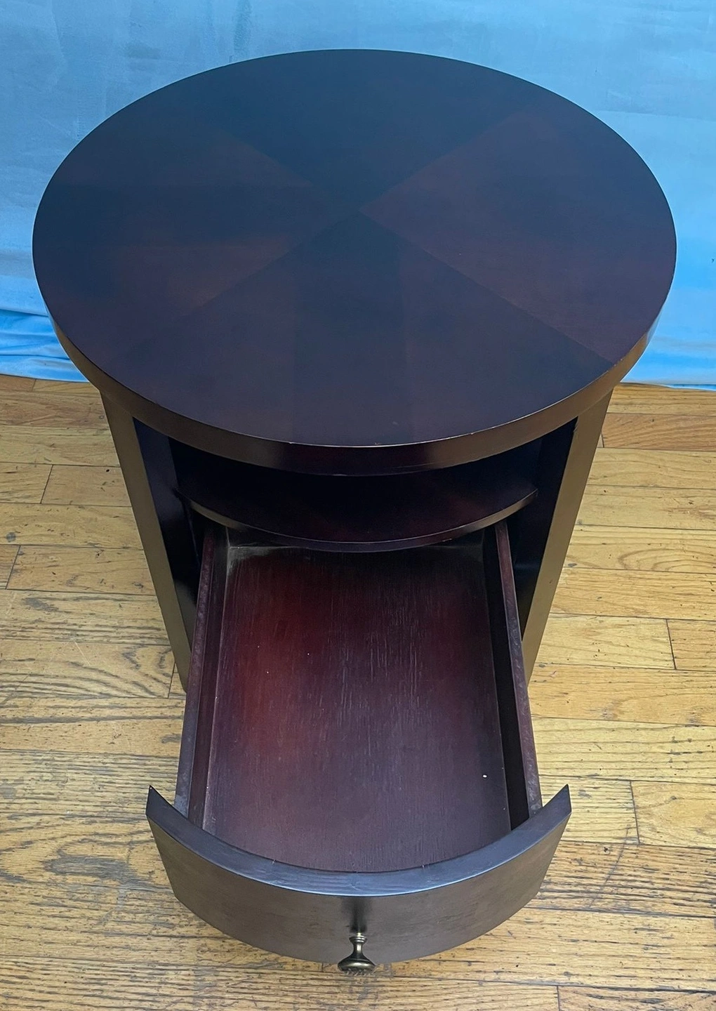 Add elegance and storage to your space with this beautiful circular mahogany side table! Perfect as a nightstand, living room accent table, or entryway piece.