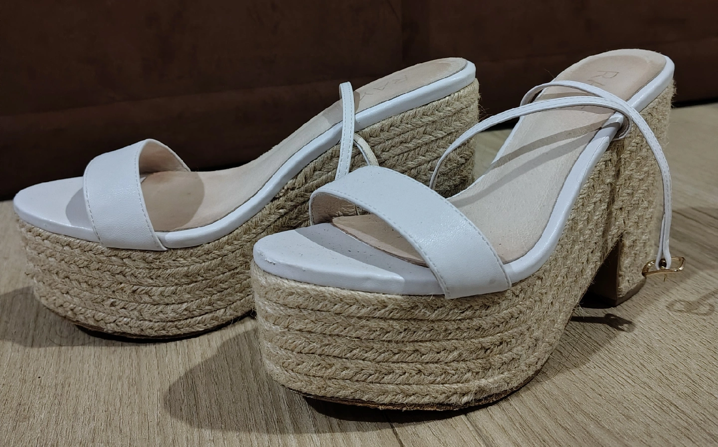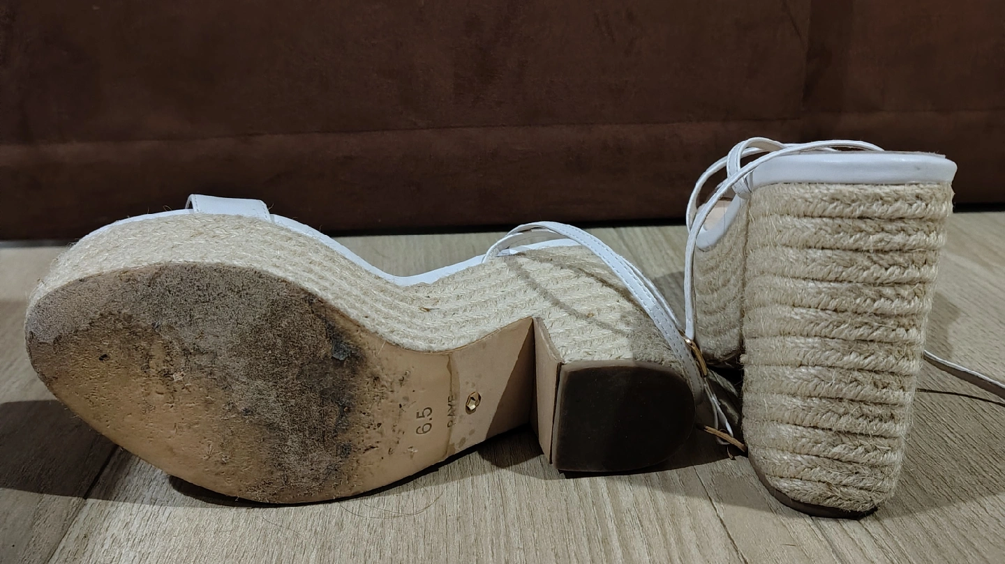 Selling a pair of platform sandals in a size 6.5. They're white with an espadrille style platform. These are perfect for summer or a Barbie/Sharpay/Paris Hilton costume 🤣 very comfortable and easy to walk in as the straps wrap around the ankles for extra support! some wear on the bottom but otherwise great condition!
