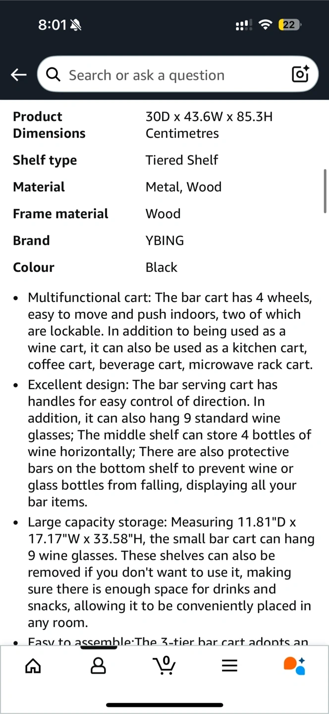 Selling a bar cart in black. It's a tiered shelf made of metal and wood. The dimensions are 30D x 43.6W x 85.3H in centimetres. It has four wheels for easy moving, and two are lockable. It can be used as a wine cart, kitchen cart, coffee cart, or beverage cart. Wine glasses & bottle storage