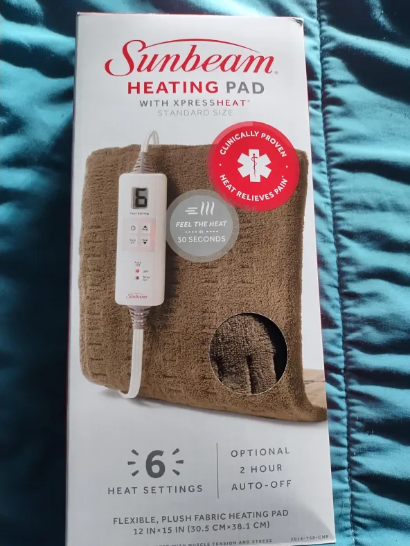 I'm selling a Sunbeam Heating Pad with XpressHeat in standard size! This flexible, plush fabric heating pad is 12 in x 15 in (30.5 cm x 38.1 cm). It has 6 heat settings and an optional 2-hour auto-off feature. It's clinically proven to relieve pain and feels the heat in 30 seconds!