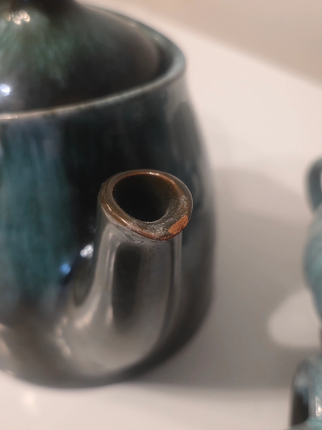 Blue Mountain Pottery This set includes a teapot with a lid, a creamer, a sugar bowl, and a cup. Teapot has a small chip on the spout Pick up at Yonge and Steeles