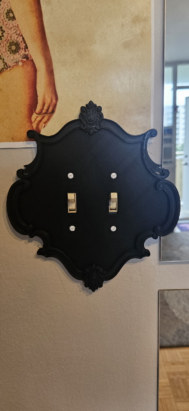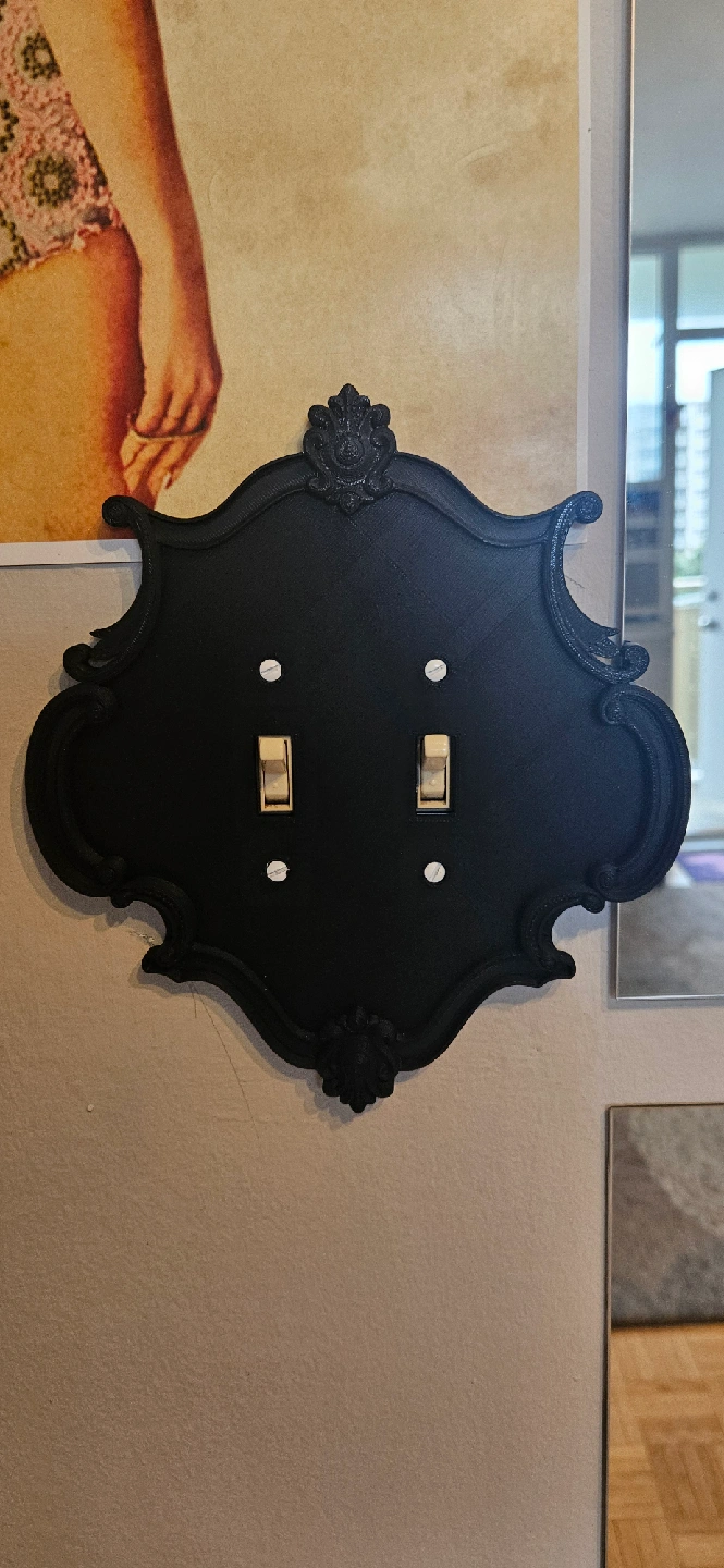 Selling a decorative black double light switch plate cover. It has a unique, ornate design that adds a touch of elegance to any room. Comes with 4 white screws.