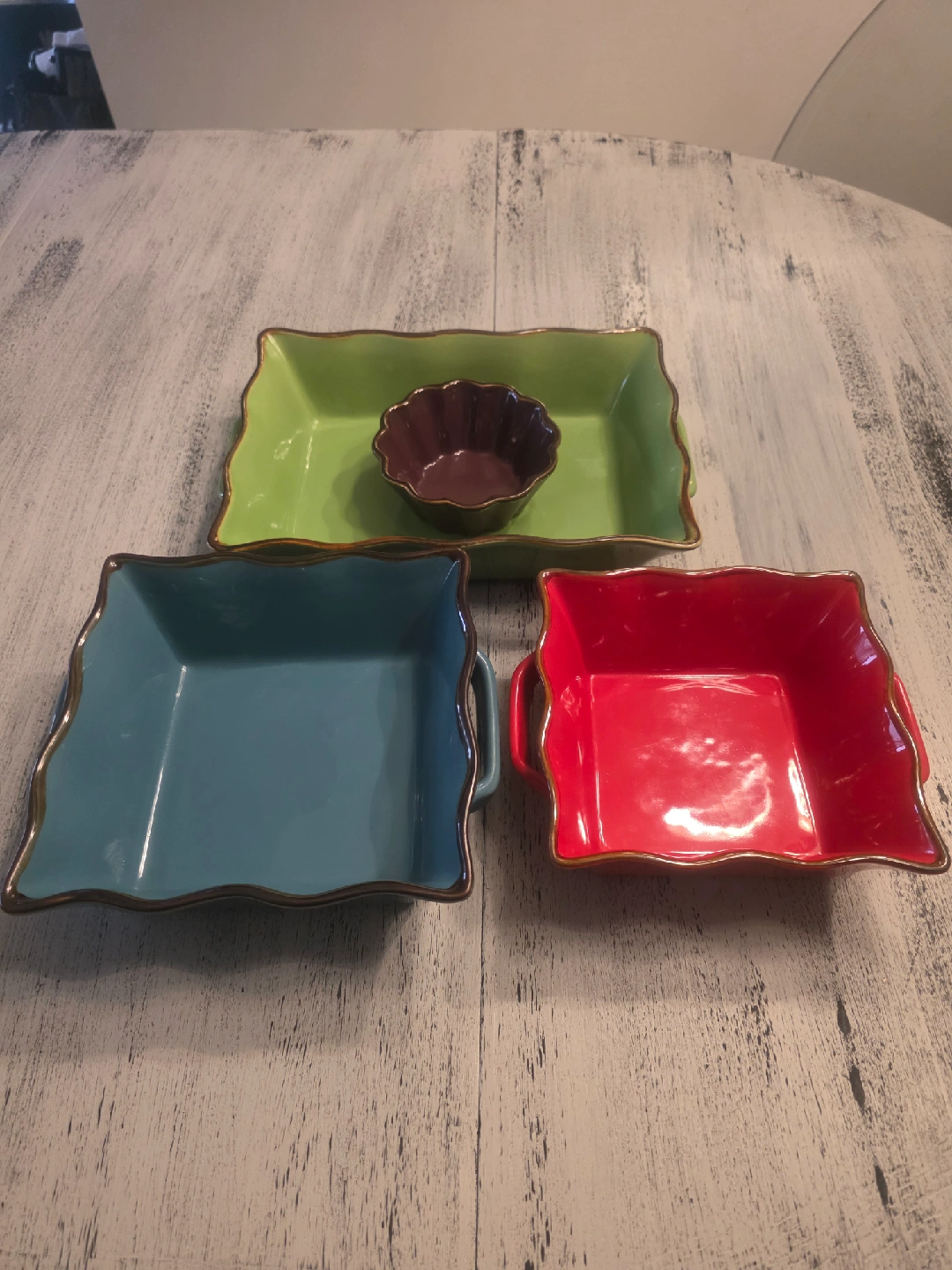 Selling a set of colourful serving dishes from Kitchen Stuff Plus The set includes a blue, red, and green dish, plus a small purple bowl. No Cracks or Chips Pick up at Yonge and Steeles