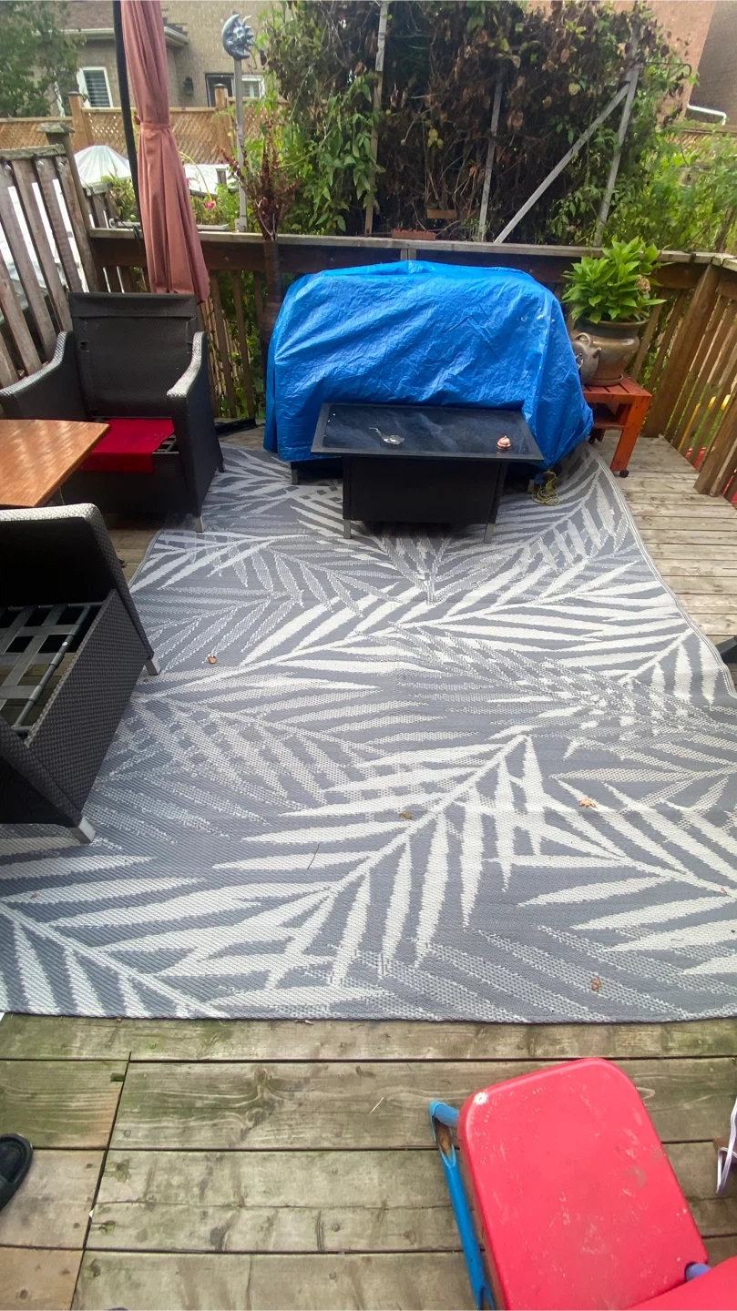 Selling a grey and white outdoor patio mat with a leaf pattern. It's in good condition and perfect for adding a stylish touch to your deck or patio Size is 10x14