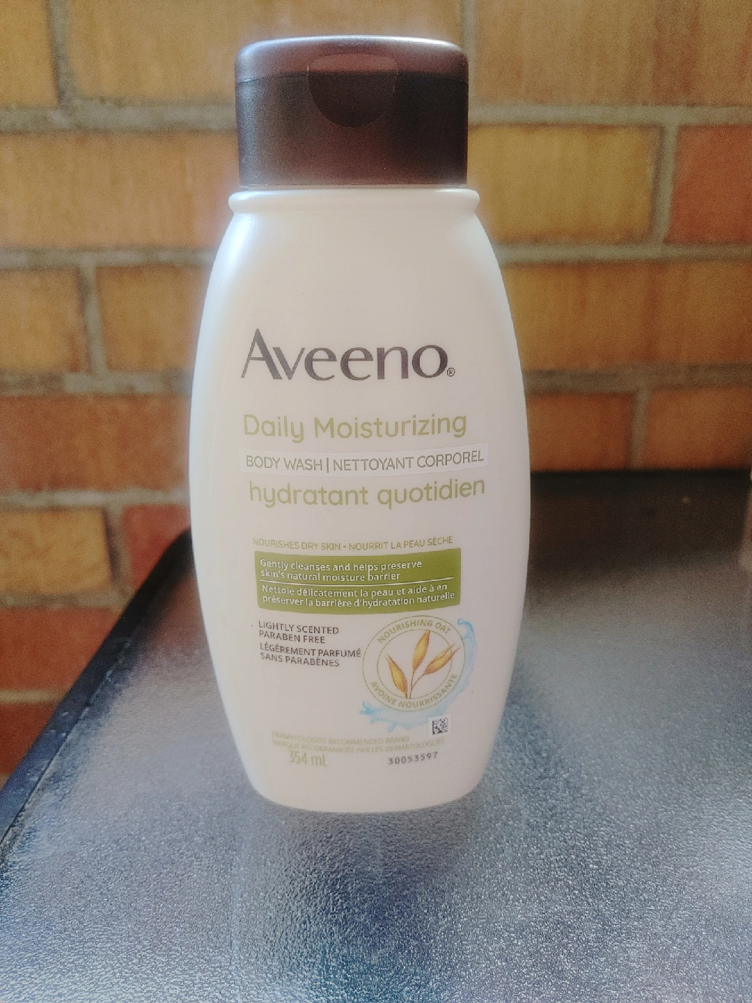 Selling a bottle of Aveeno Daily Moisturizing Body Wash. It gently cleanses and helps preserve your skin's natural moisture barrier. It's lightly scented and paraben-free. Contains nourishing oat. The bottle is 354 ml