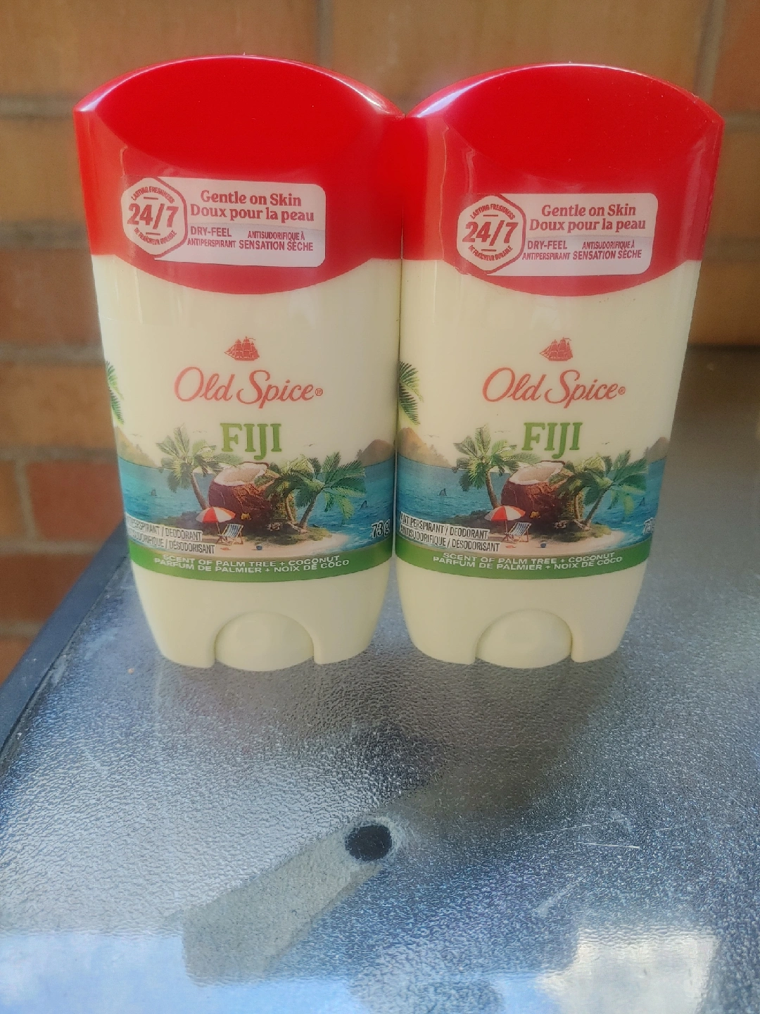 Selling two Old Spice Fiji deodorants! They are gentle on the skin and provide a dry feel with lasting freshness. The scent is palm tree and coconut, perfect for summer