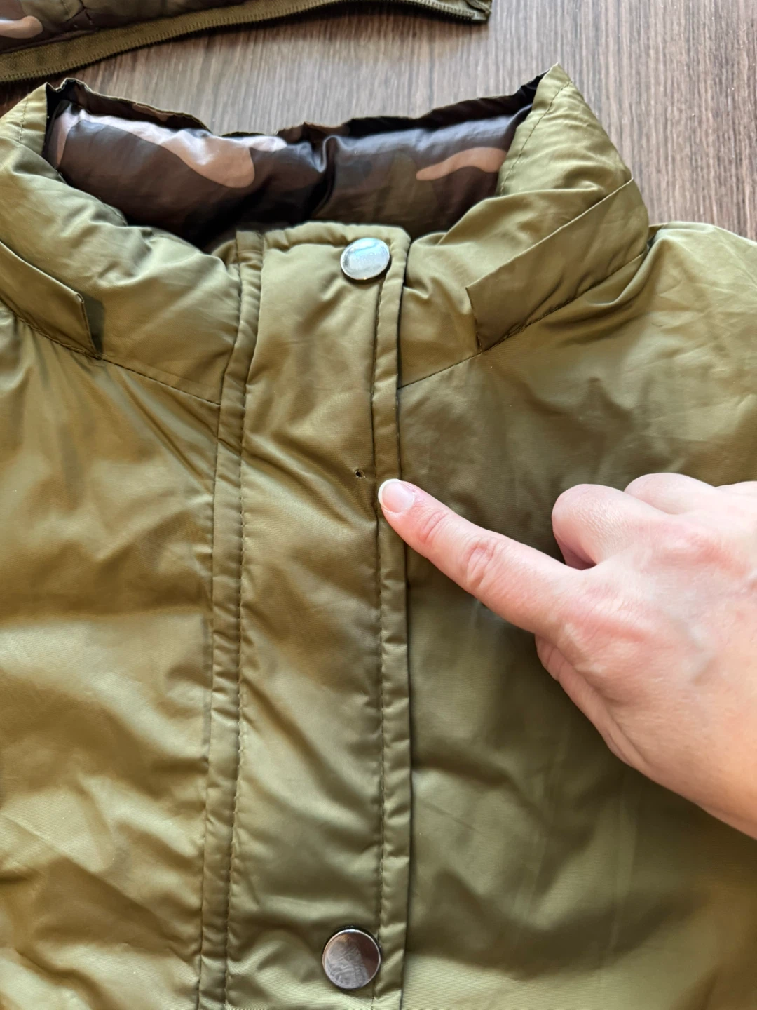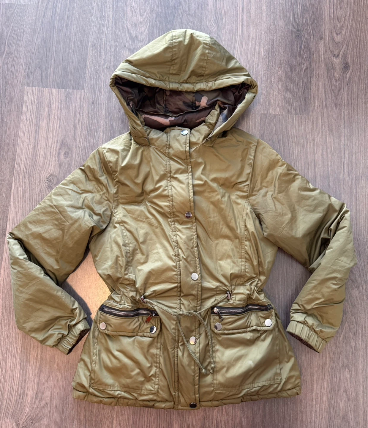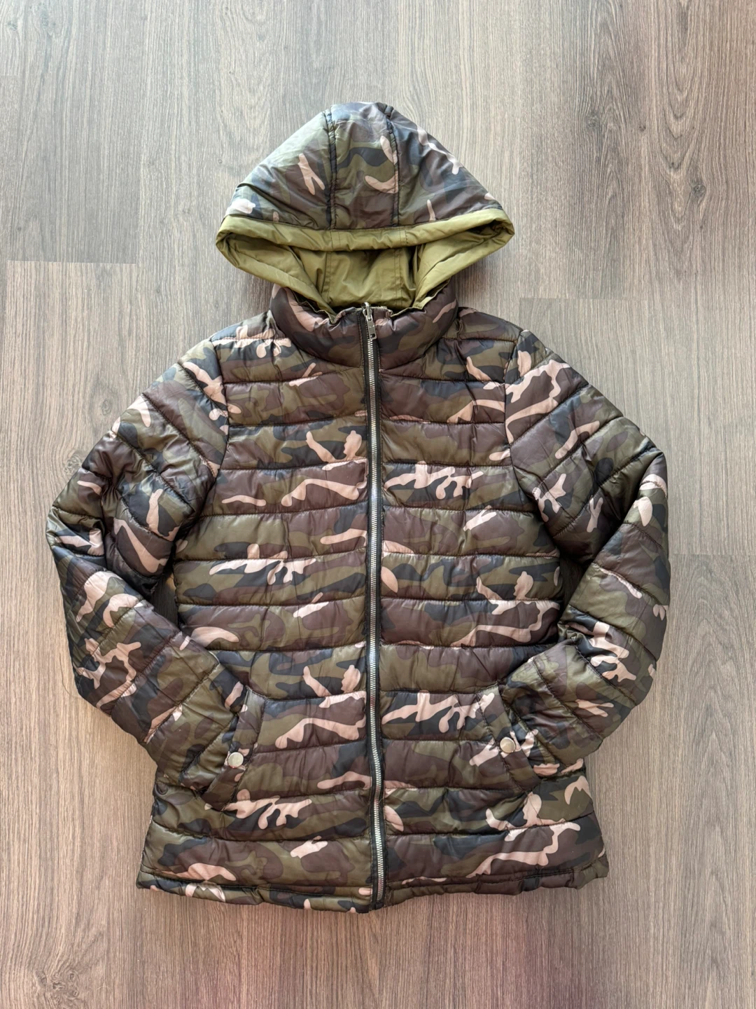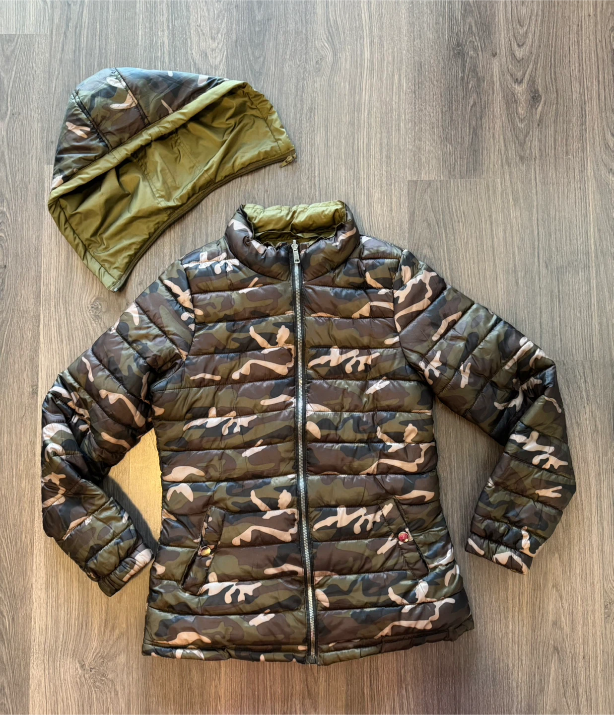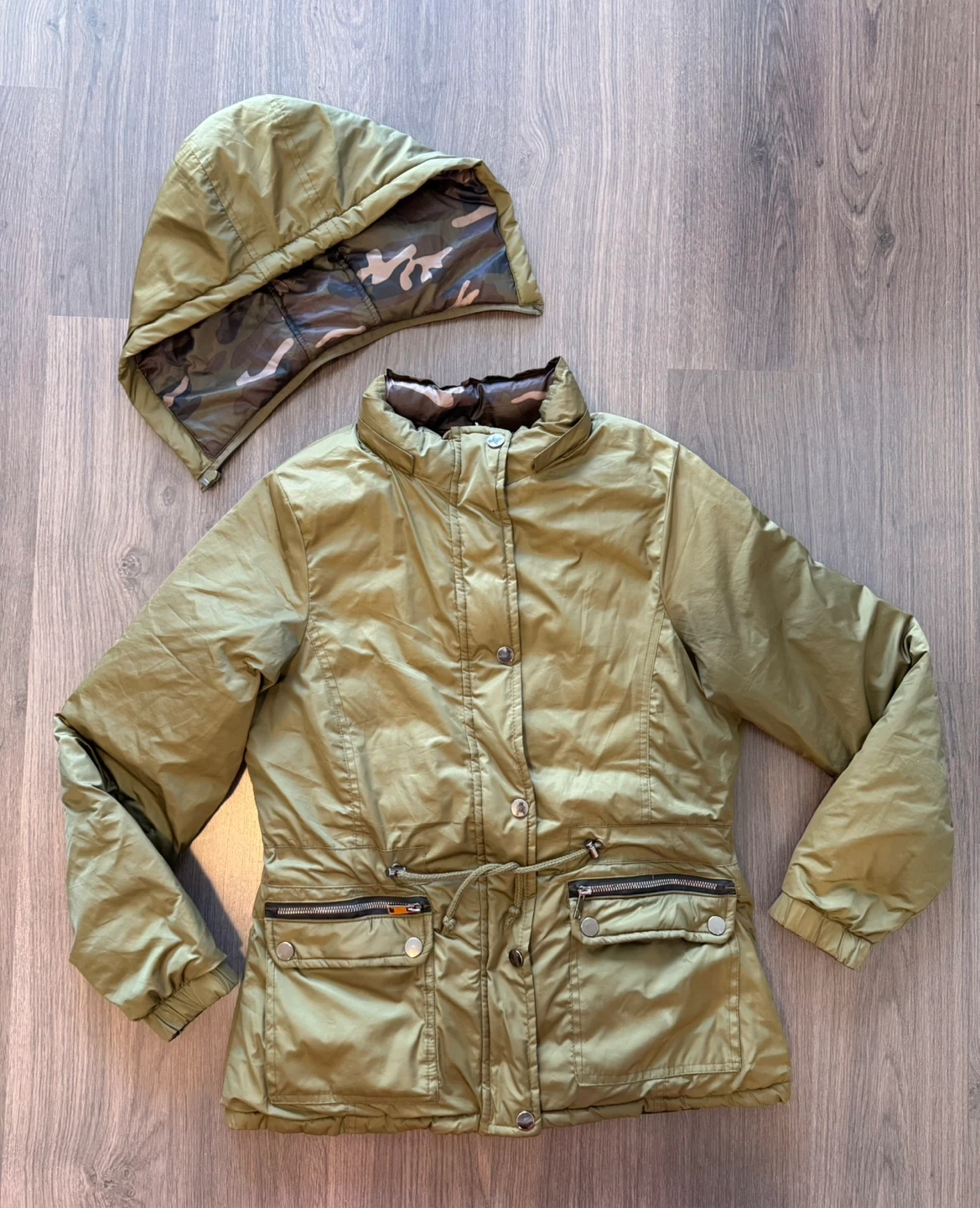Selling a reversible jacket with a detachable hood! It's in good condition and perfect for keeping warm. There is a small hole near the collar, as shown in the picture (I used to style it using a pin)