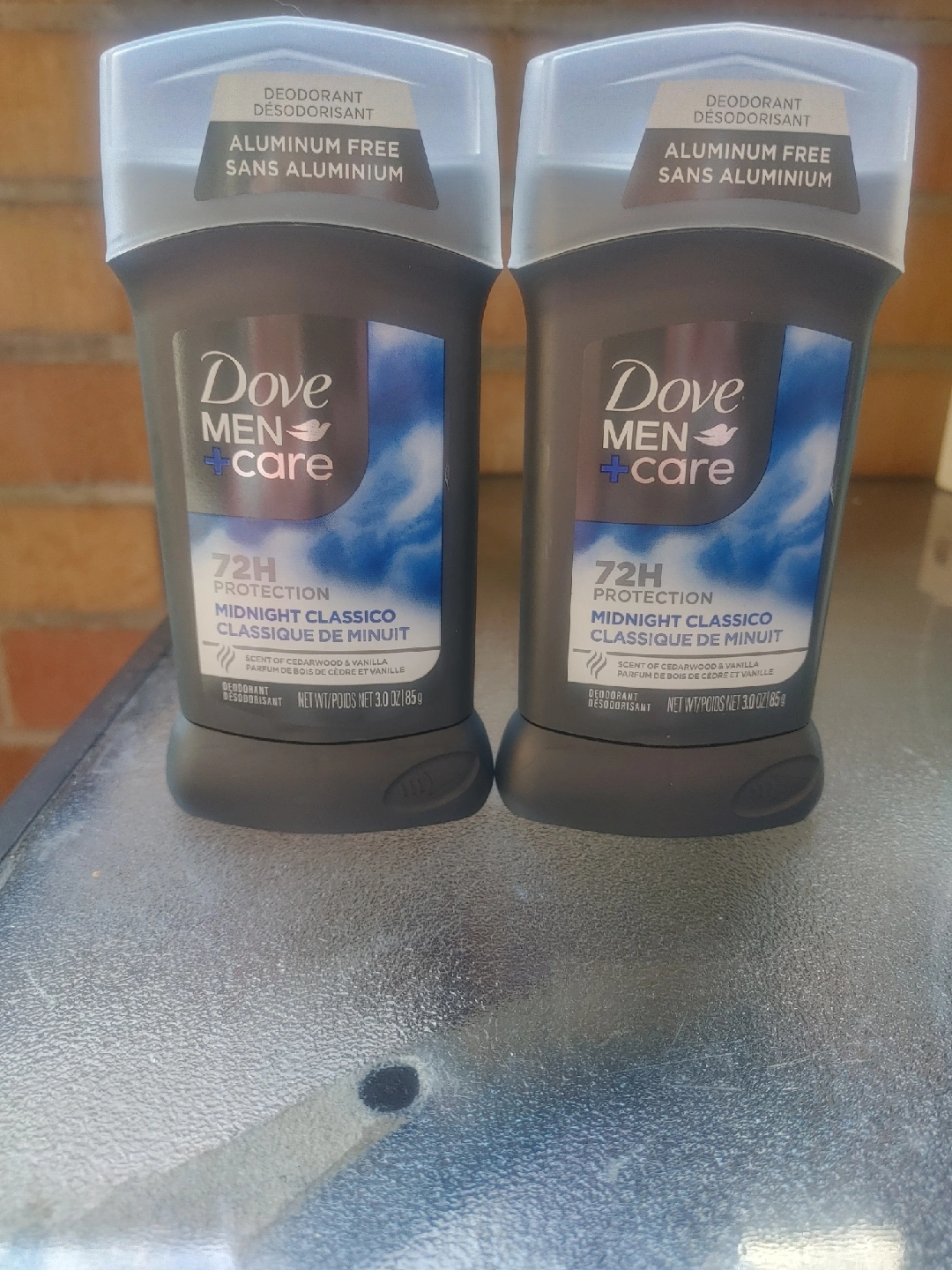 Selling two Dove Men+Care Midnight Classico deodorants. They are aluminum-free and provide 72-hour protection. The scent is cedarwood and vanilla, and each deodorant contains 3.0 oz / 85 g