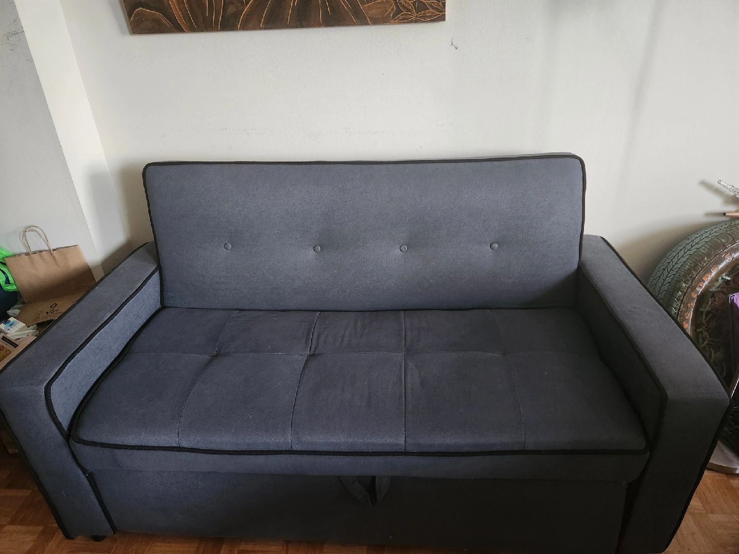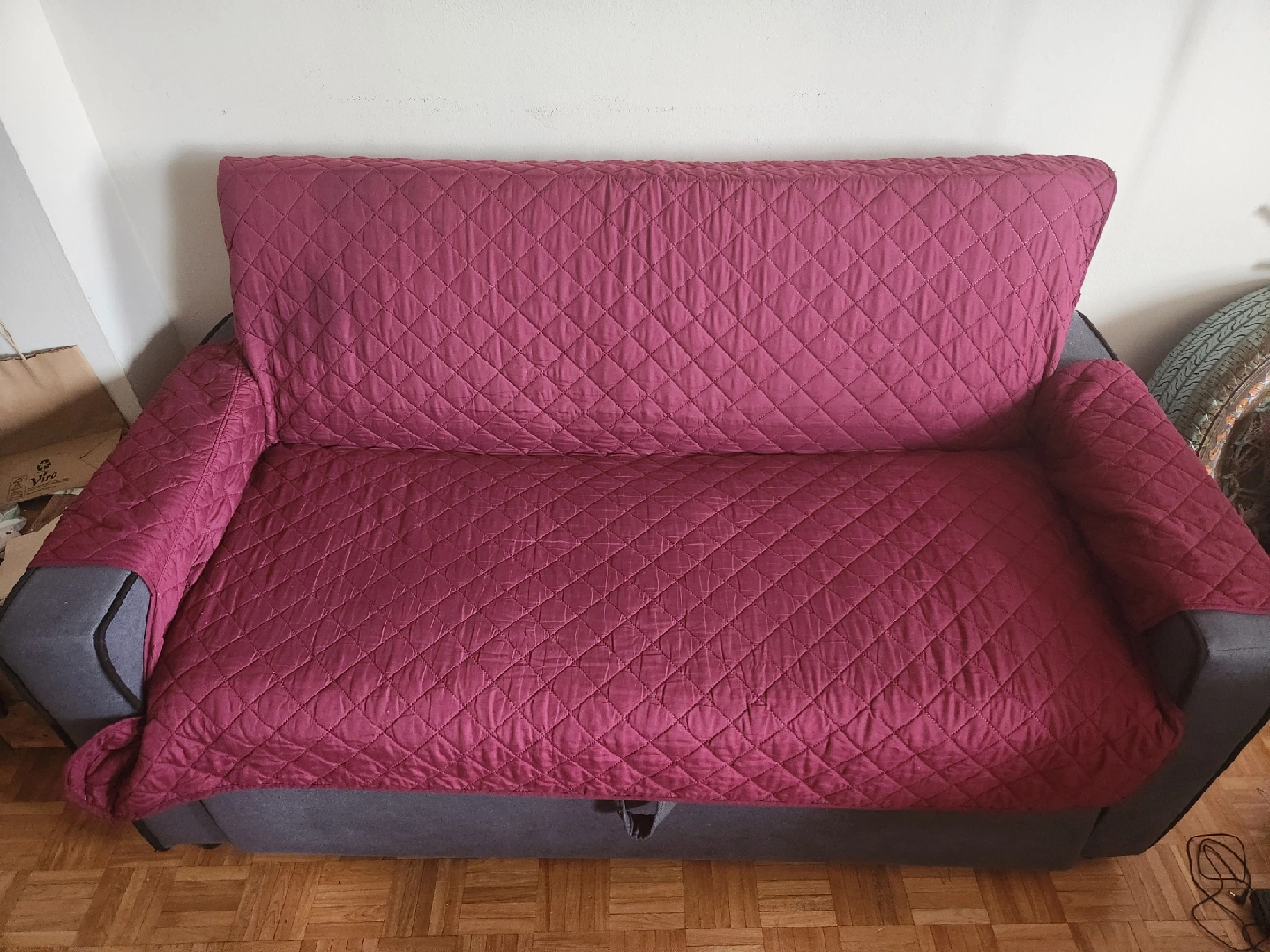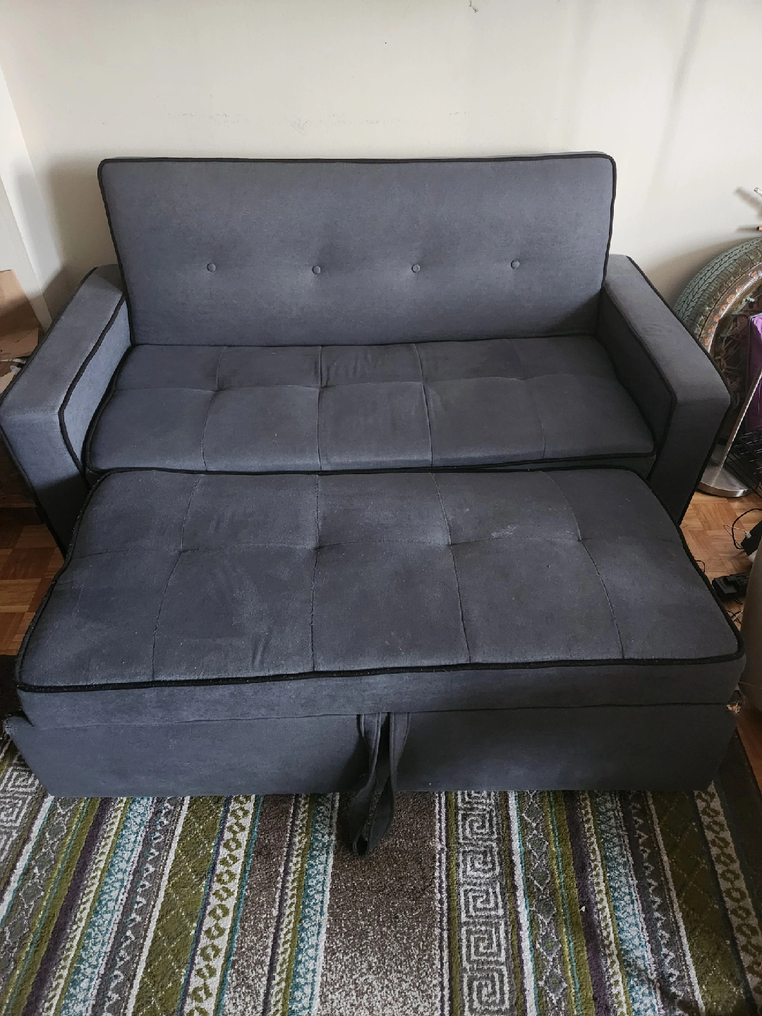 Selling a grey futon sofa bed. It has a pull-out section to convert into a bed. There is some minor damage on one corner, as shown in the pictures, but otherwise it's in good condition. It has always been covered by this reversible cover. Used the beige side in spring and summer and the burgundy side in fall & winter. Cover included.