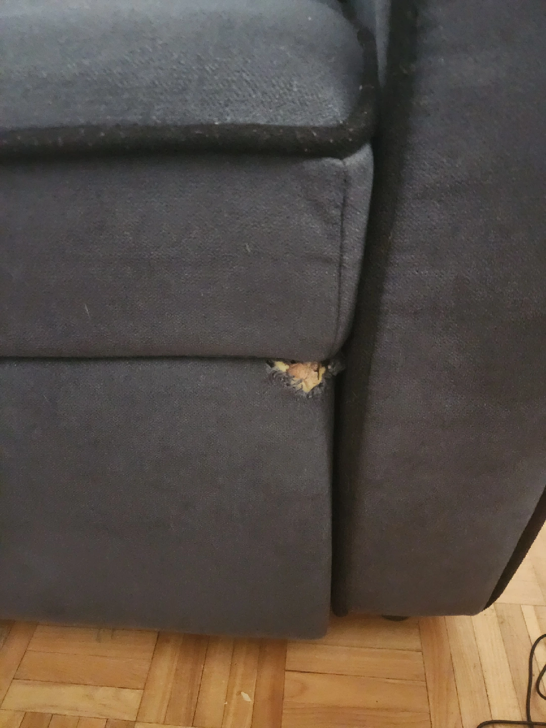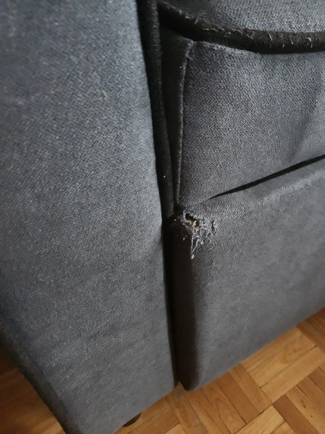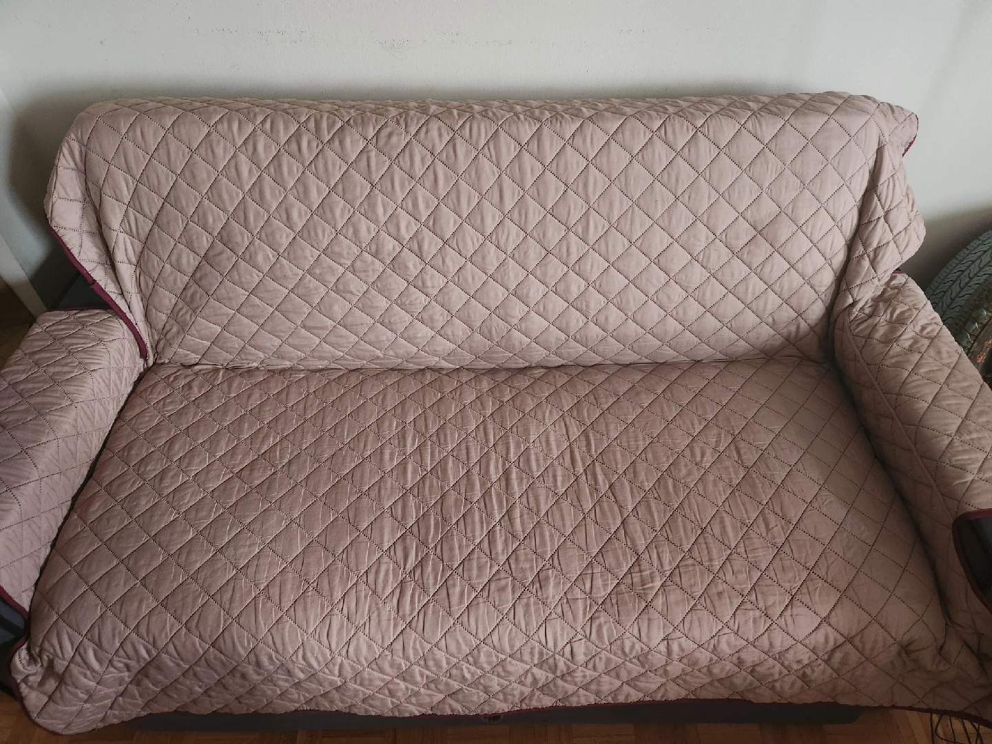 Selling a grey futon sofa bed. It has a pull-out section to convert into a bed. There is some minor damage on one corner, as shown in the pictures, but otherwise it's in good condition. It has always been covered by this reversible cover. Used the beige side in spring and summer and the burgundy side in fall & winter. Cover included.