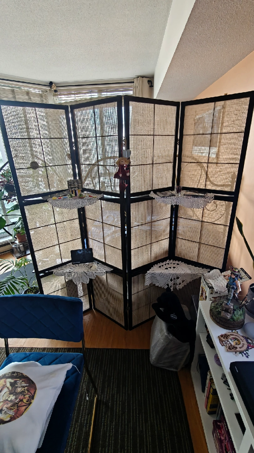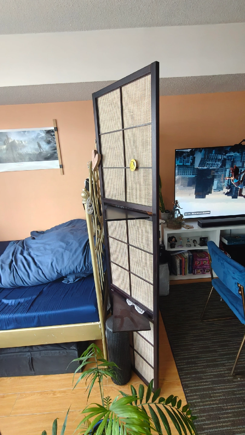 Selling a folding woven room divider screen. It's great for adding privacy or dividing a space in your home. The screen features a dark frame with woven panels, adding a touch of texture and style to any room. It has two wooden panels running through it, which turn into two 4 shelves on the front and two on the back. The entire piece folds into an easy size to carry and transport