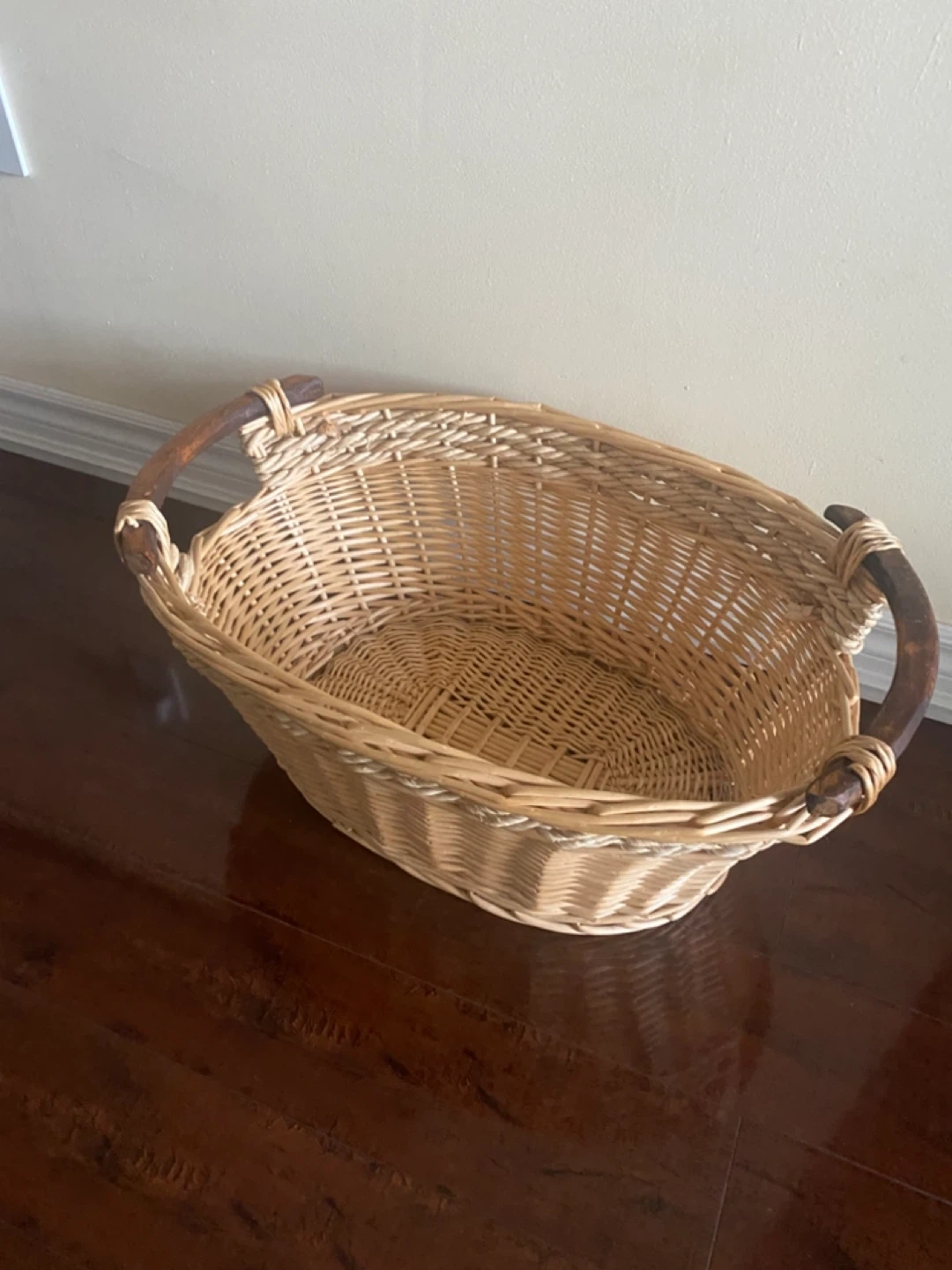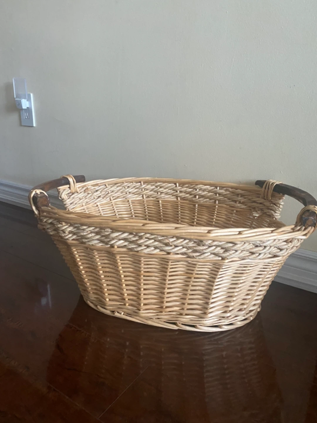 Selling a lovely wicker basket with sturdy wooden handles! It's in great shape and perfect for storage or decor. The natural wicker and dark wood handles give it a warm, rustic feel. It's a good size for blankets, toys, or even plants.