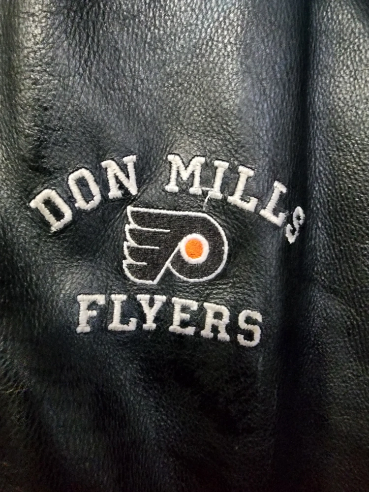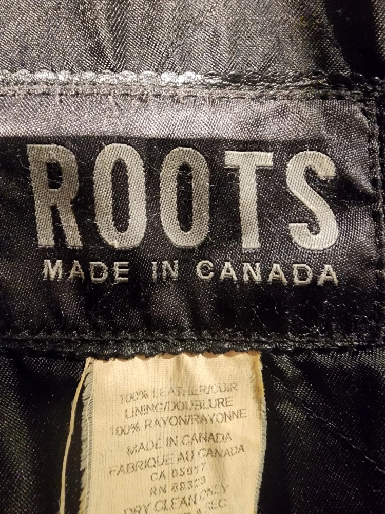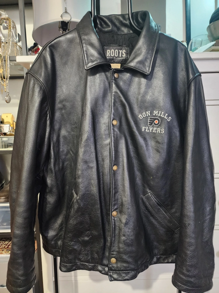 Here's a vintage Roots Don Mills Flyers black leather jacket, perfect for any hockey fan. This jacket is in good condition, showing some wear but plenty of life left. Key Features: * Brand: Roots * Team: Don Mills Flyers * Material: 100% Leather * Made in Canada * Size: XL If you're reading this, the jacket is still available! Grab it before it’s gone!