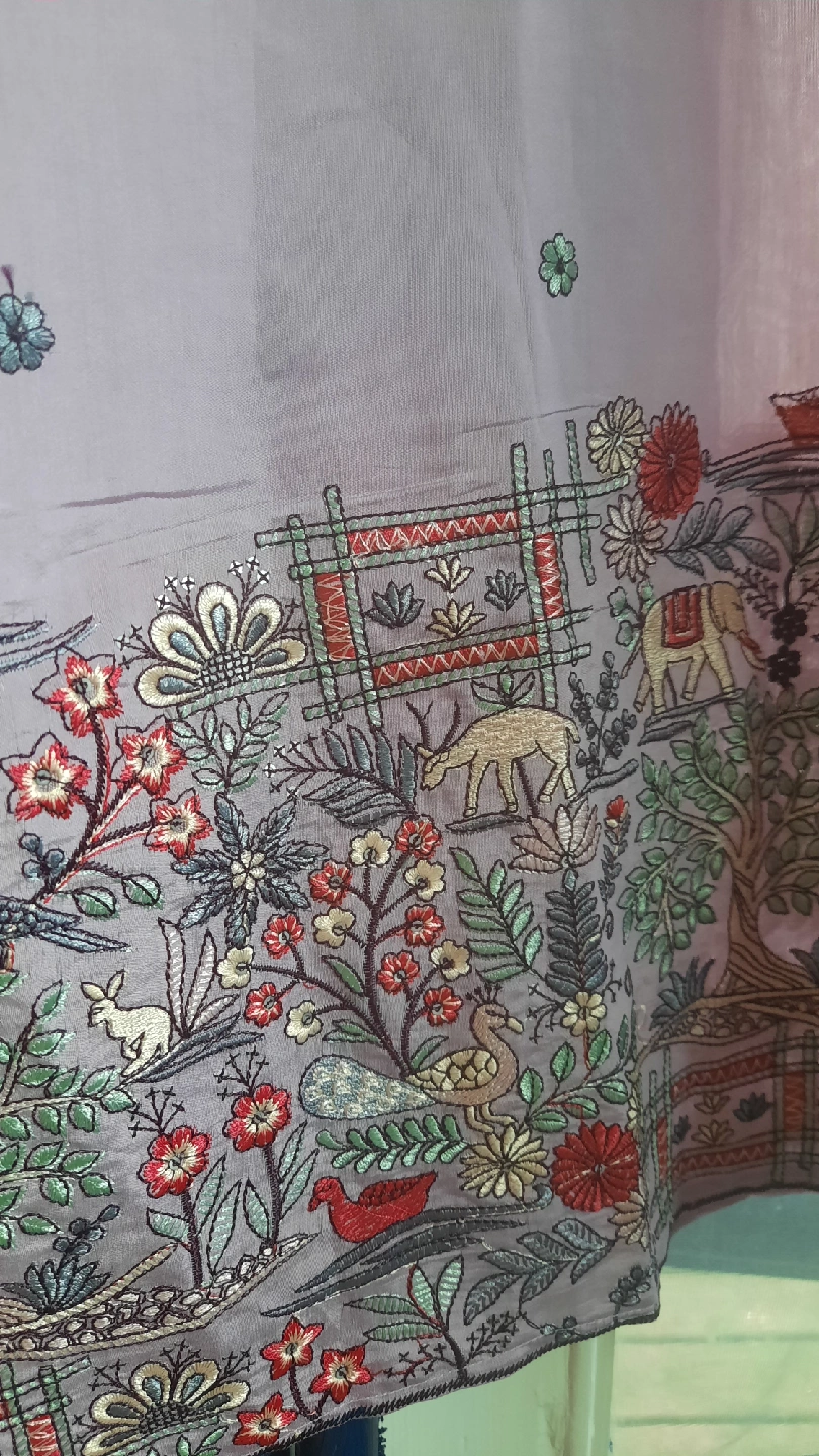 Selling a pretty lavender tunic with floral embroidery. The material is lightweight and perfect for warmer weather, or relaxing comfortably around the house. It features a unique design at the bottom with hand embroidered animals and plants, and colorful embroidered flowers throughout. Never worn.