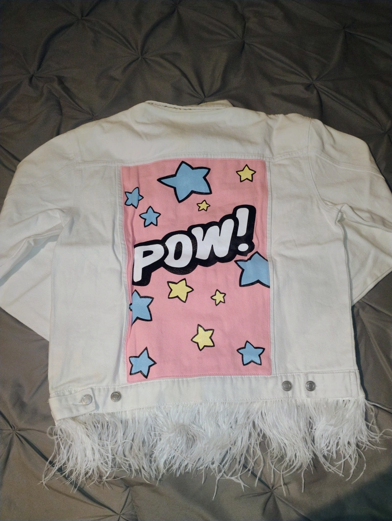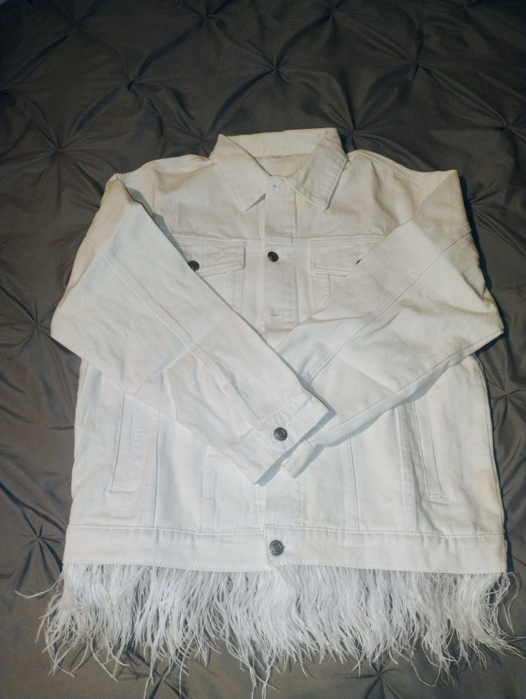 Cute white denim jacket with a fun design on the back and feather trim. It's in great condition and ready for a new home!