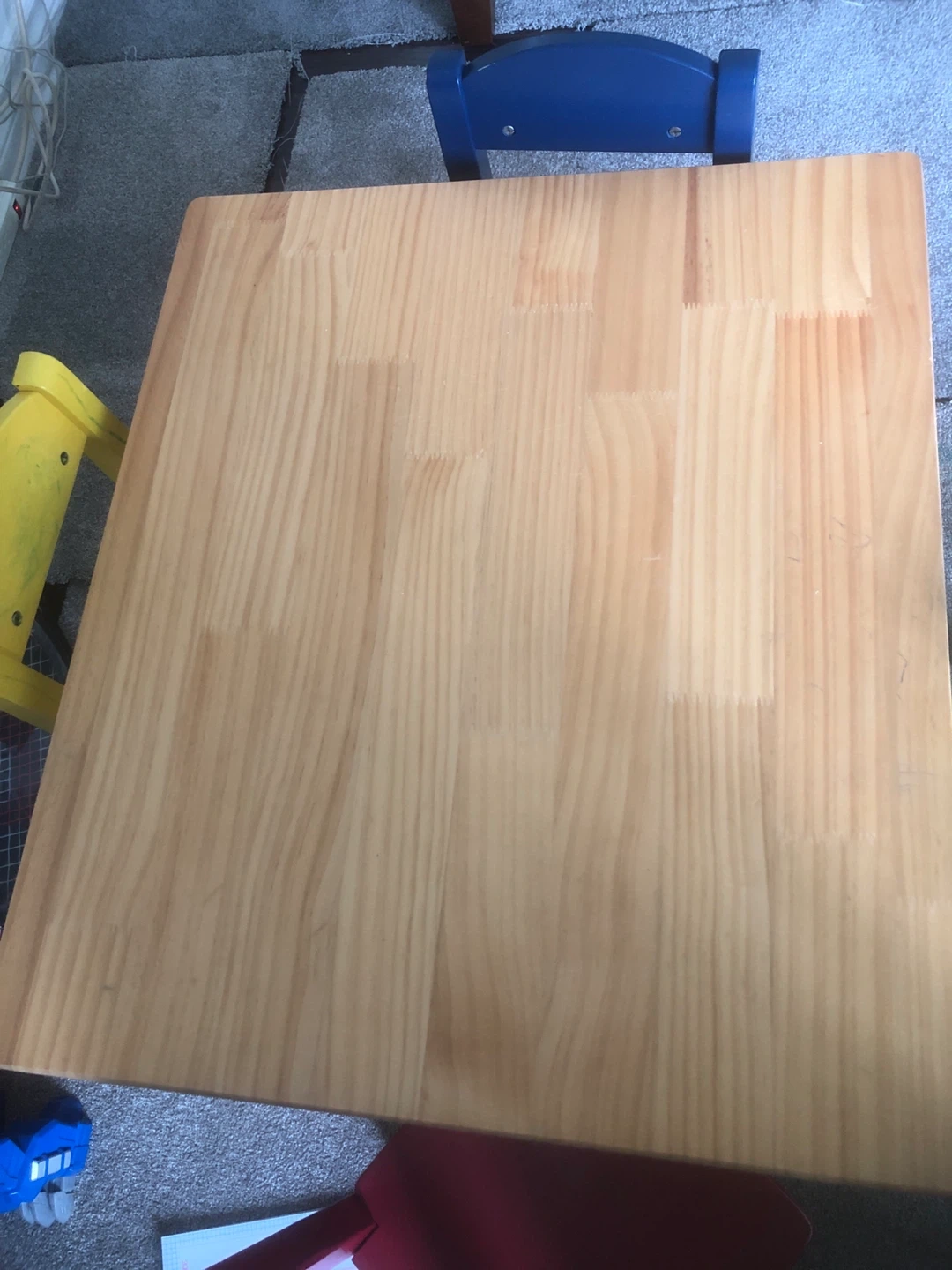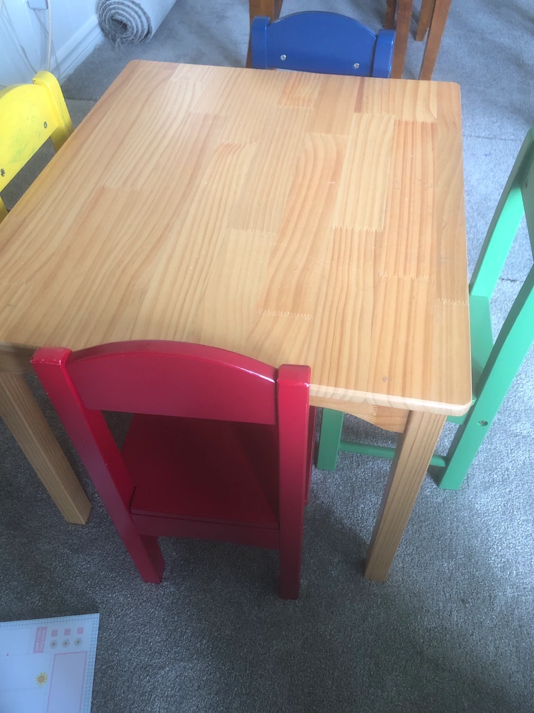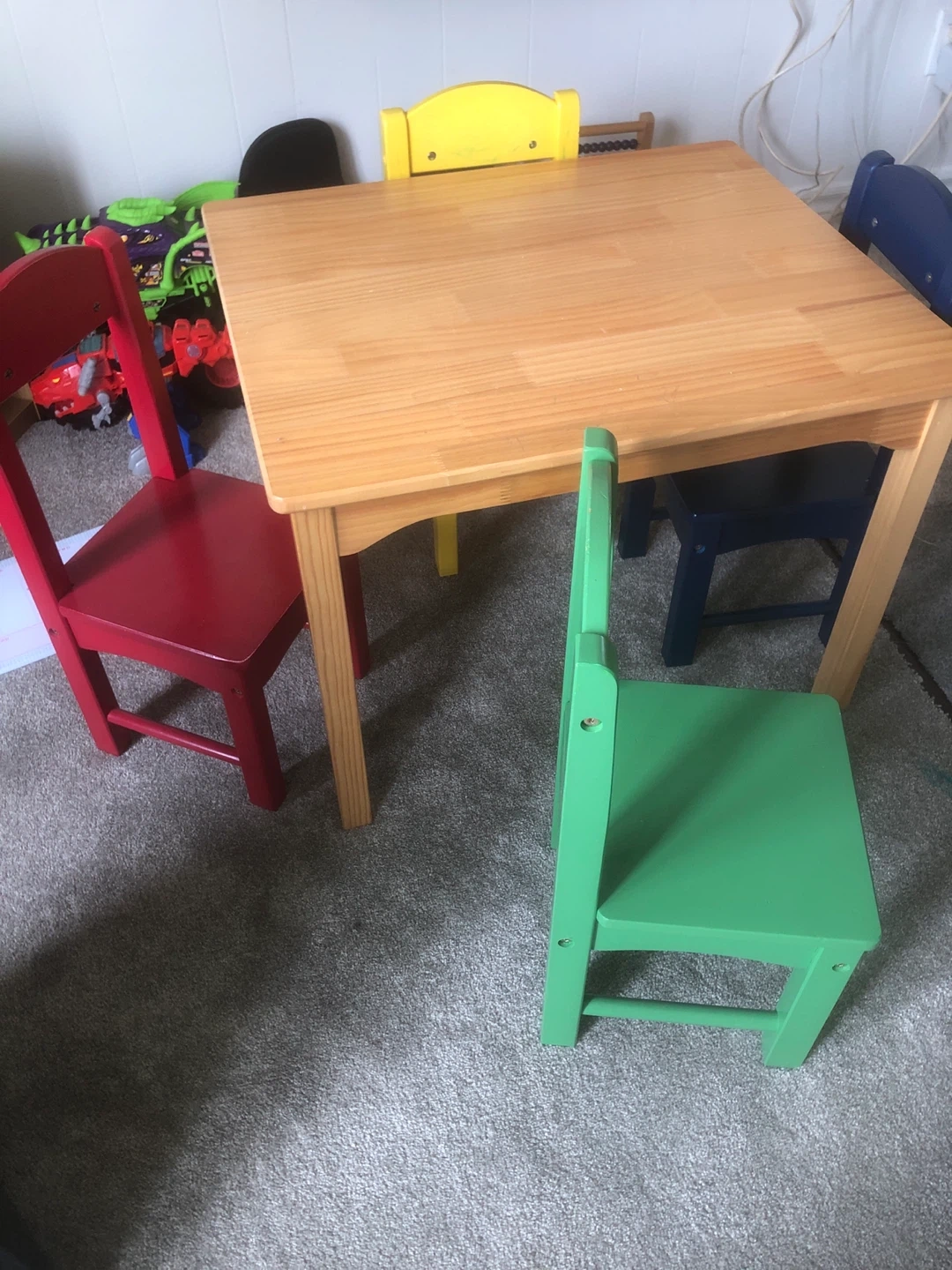 A cute little table and chairs set for kids! The chairs are in red, yellow, green, and blue. Perfect for arts and crafts, snack time, or just hanging out