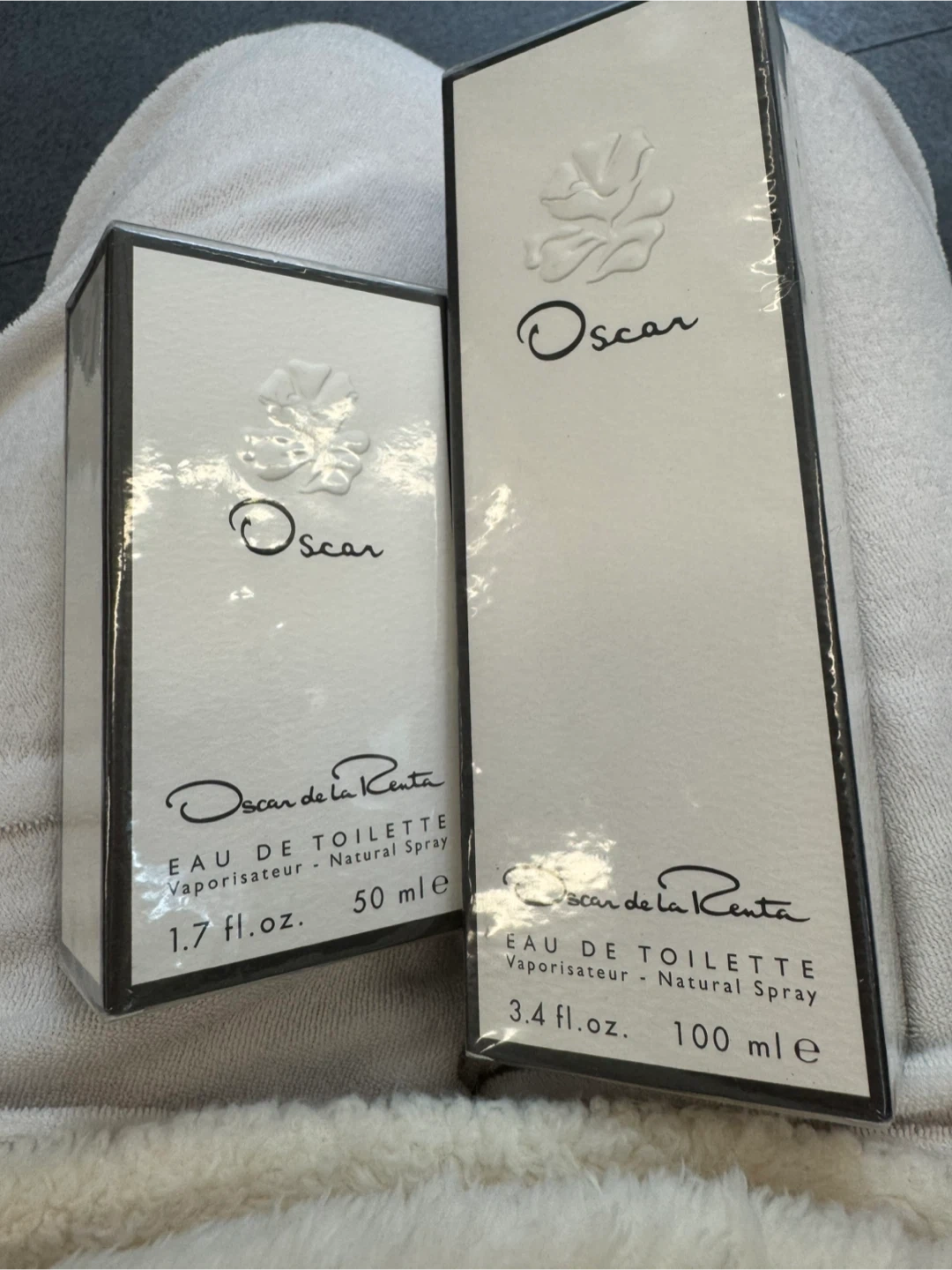 Selling a set of Oscar de la Renta Eau de Toilette fragrances. One is 50 ml (1.7 fl.oz.) and the other is 100 ml (3.4 fl.oz.). Both are natural sprays and come in their original boxes