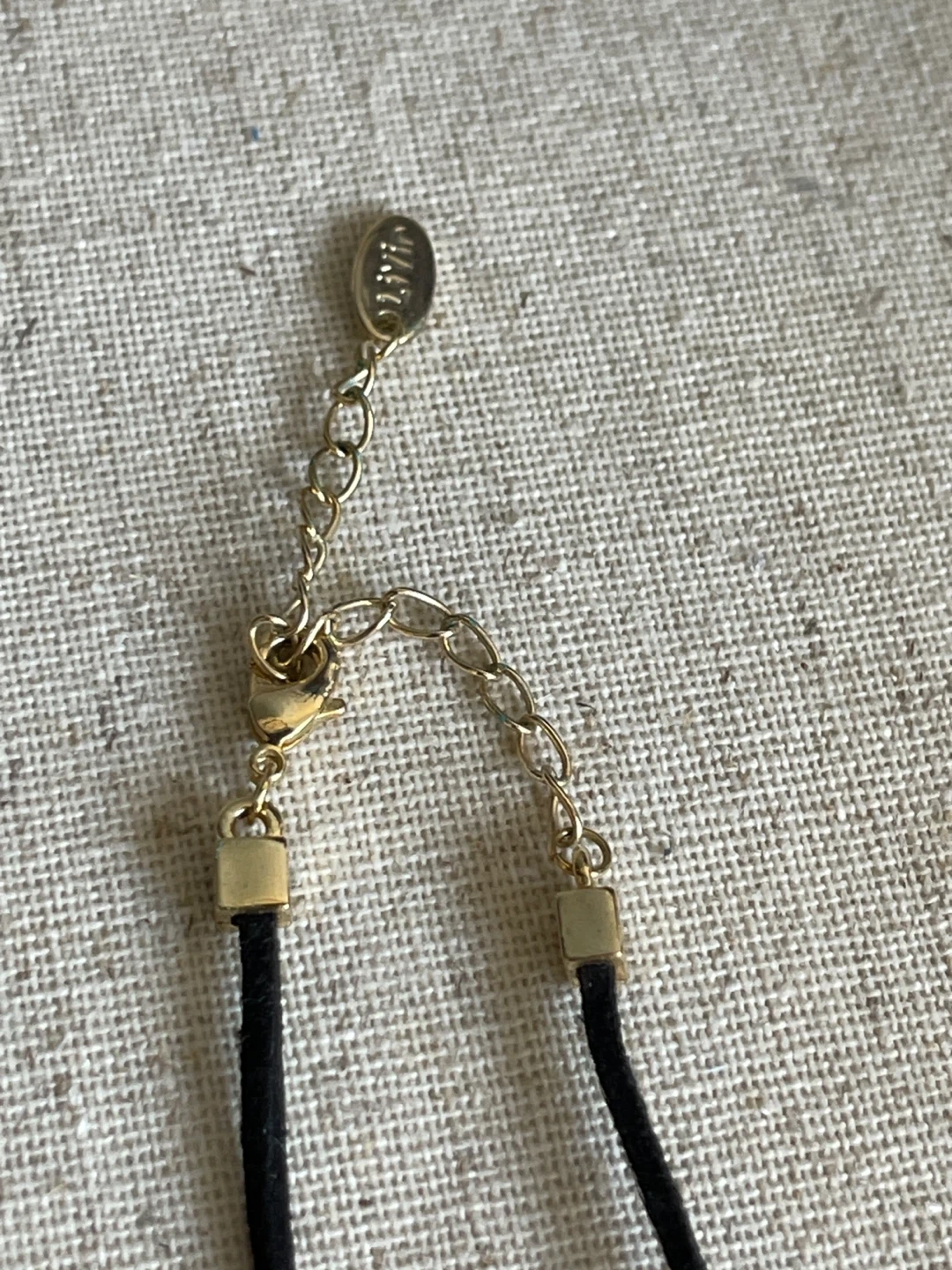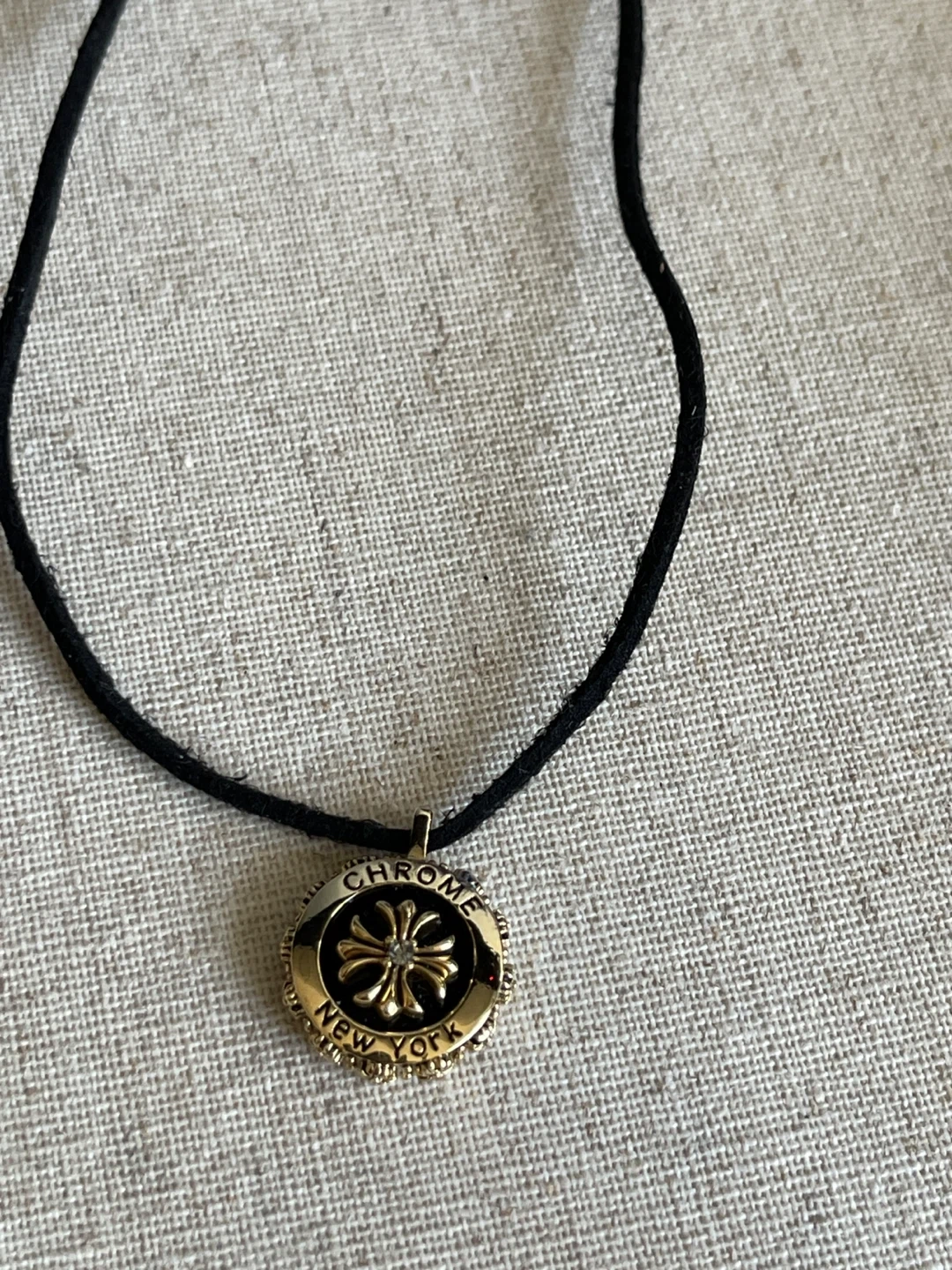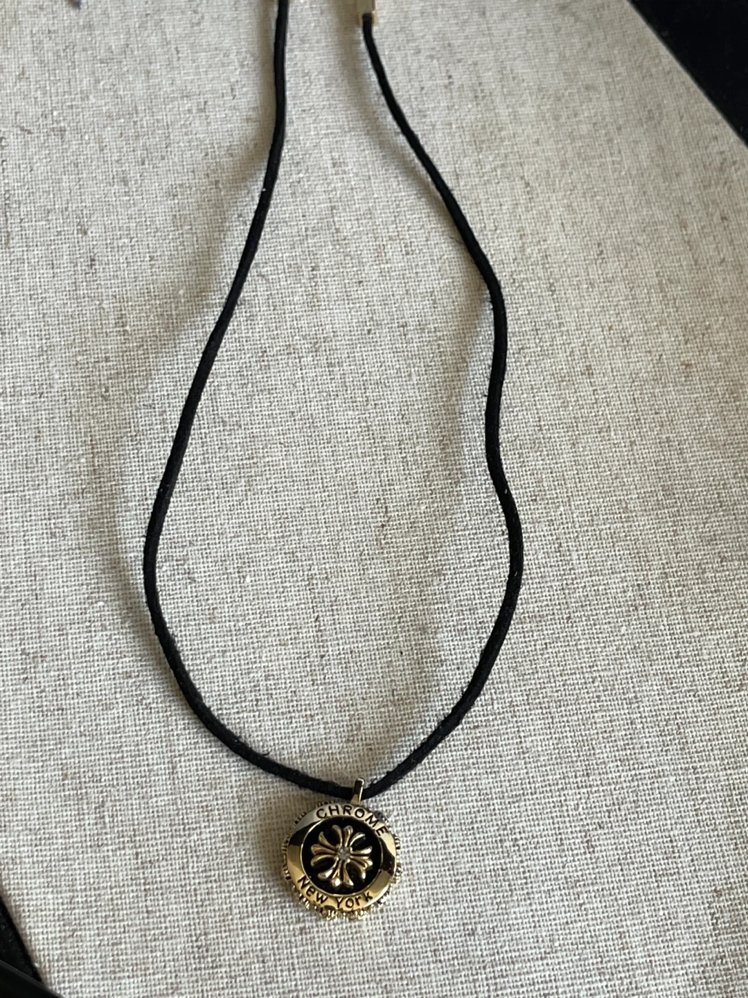 Selling a similar Chrome Hearts style pendant necklace. The pendant is gold with black detailing and says 'Chrome Hearts New York'. The necklace cord is black.