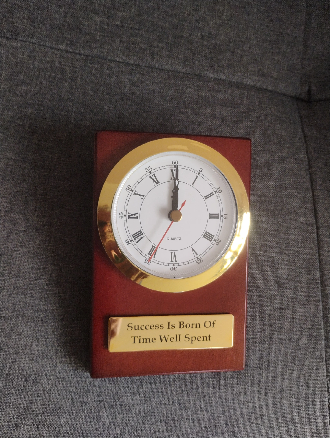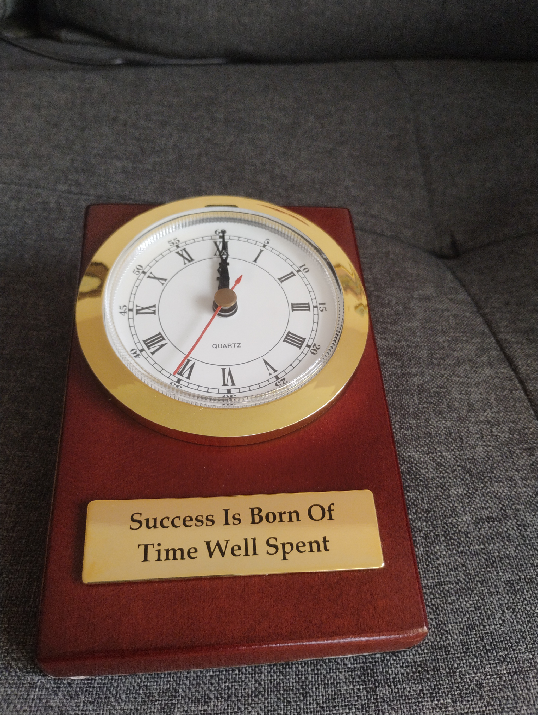A lovely clock with a gold-tone bezel and a mahogany-coloured base. The clock face has Roman numerals. The base has a plaque that reads "Success Is Born Of Time Well Spent". It's a great piece for any desk or shelf!