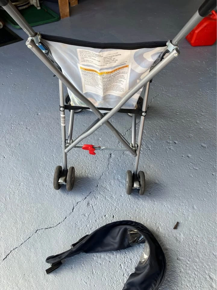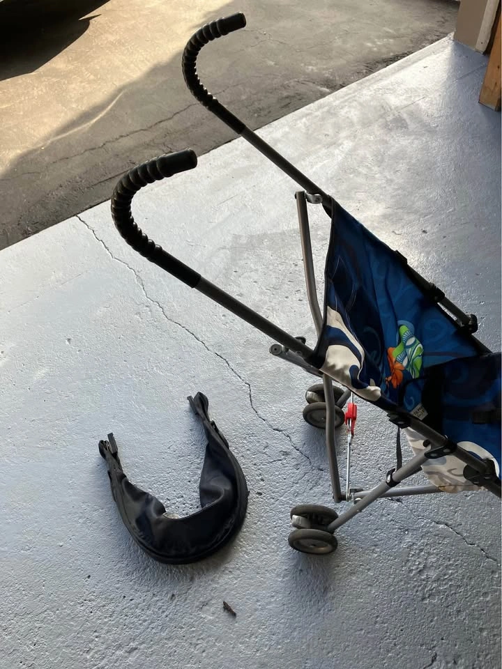 Folding umbrella stroller. Brakes work well. Easy to fold and has a clip to hold it closed. Foldable & Removable sun hood has plastic see-through flap. Located in Waterdown near Dairy Queen