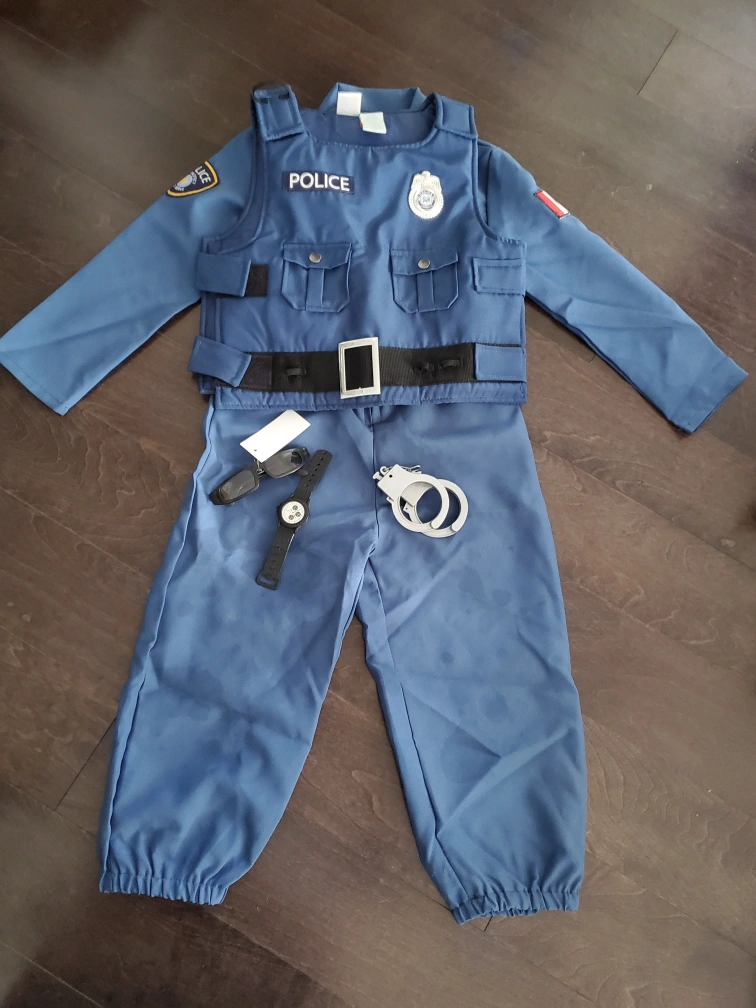 177Selling a cute kids' police costume! It includes the jacket with 'POLICE' on it, pants, toy handcuffs, a toy watch, and toy sunglasses. Perfect for dress-up or Halloween Ages 5-6