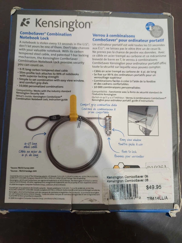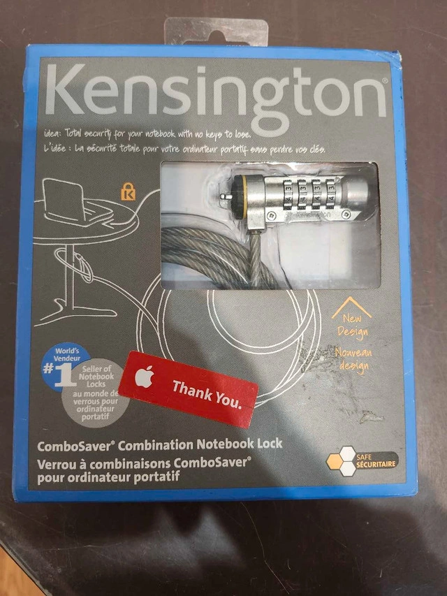 65Keep your laptop safe with this new Kensington ComboSaver Combination Notebook Lock, providing robust security and peace of mind. This lock features a combination mechanism, so there are no keys to lose! Never have to worry about someone walking off with your valuable computer again! Here are some features: * 6-ft long tempered steel cable * Slim-profile lock * Simple to set combination with easy view window * 10,000 possible combinations **Please note that this listing is for a business, I'm not selling it personally. Please kindly call 705-726-4063 should you have any questions about this item.** To see this and many more of the useful items we have in stock, come and see the friendly, helpful staff at Dr. Computer Logick's Walk-In Clinic in Barrie! We are conveniently located at 169 Bayfield Street in Barrie and we're open to serve you Monday to Friday from 10-5. We have something for every need and budget, so don't delay! Come and get your deal today!