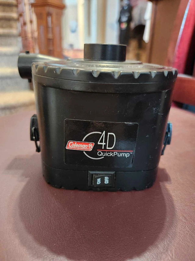 65I'm selling a Coleman 4D QuickPump, a portable and battery-operated pump designed for inflating airbeds, mattresses, and other inflatables quickly and easily. It is in good condition and ready for your next camping trip or unexpected guests! Requires 4 D-cell batteries (not included). Compact design: Easy to store and carry. Versatile use: Suitable for various inflatables. **Please note that this listing is for a business, I'm not selling it personally. Please kindly call 705-726-4063 should you have any questions about this item.** To see this and many more of the useful items we have in stock, come and see the friendly, helpful staff at Dr. Computer Logick's Walk-In Clinic in Barrie! We are conveniently located at 169 Bayfield Street in Barrie and we're open to serve you Monday to Friday from 10-5. We have something for every need and budget, so don't delay! Come and get your deal today!