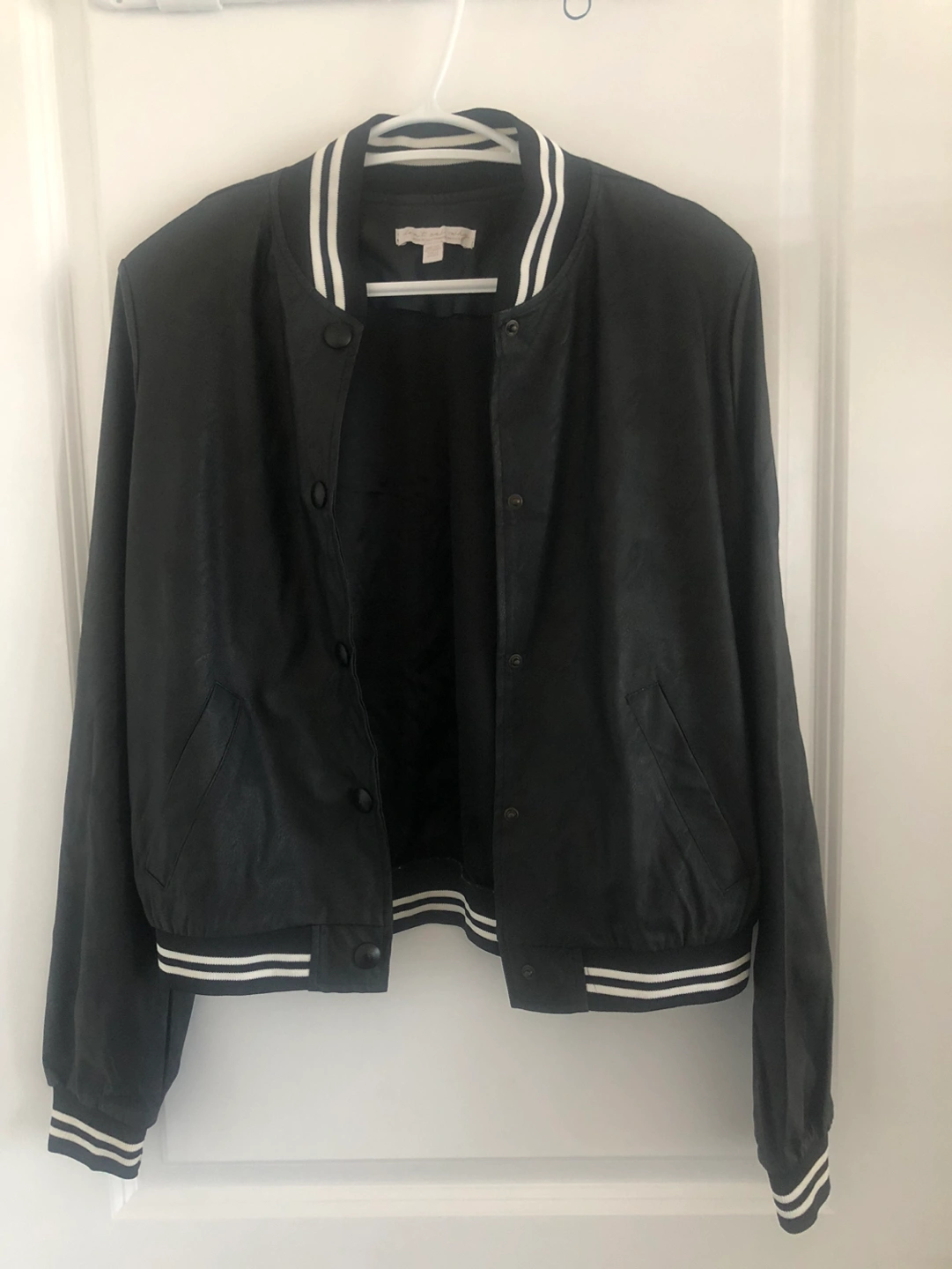 American Eagle black bomber jacket in ‘one size fits most’ but it’s more for size S to M folks. Never been worn before.