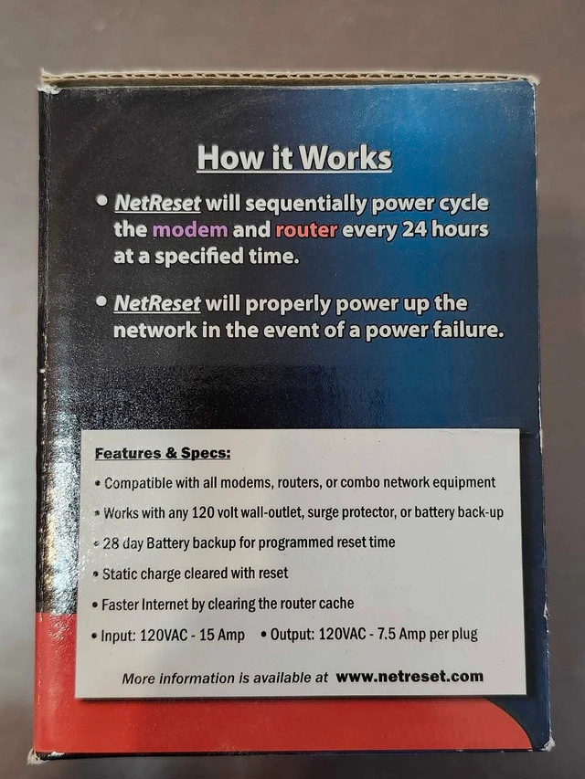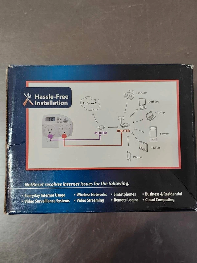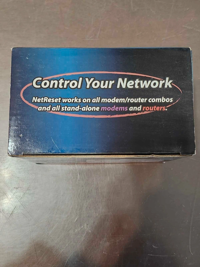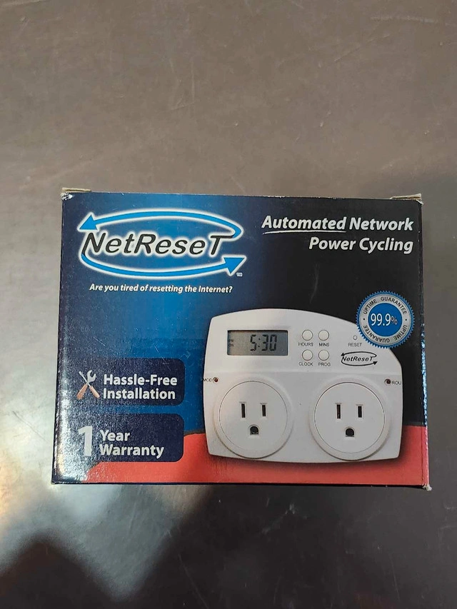 65I'm selling a NetReset automated network power cycling device, brand new in its original packaging. This device automatically power cycles your modem, router, and any other network device. A must-have for any and all networks! Here are some of its features: * Compatible with all modems, routers, or combo network equipment * Works with any 120 volt wall-outlet, surge protector, or battery back-up * 28 day Battery backup for programmed reset time * Static charge cleared with reset * Faster Internet by clearing the router cache * Input: 120VAC - 15 Amp; Output: 120VAC - 7.5 Amp per plug Why bother getting up to reset your router when you can have it done automatically? If this ad is still up, yes, it's still available. Get it before it's gone! **Please note that this listing is for a business, I'm not selling it personally. Please kindly call the phone number listed on the ad should you have any questions about this item.** To see this and many more of the useful items we have in stock, come and see the friendly, helpful staff at Dr. Computer Logick's Walk-In Clinic in Barrie! We are conveniently located at 169 Bayfield Street in Barrie and we're open to serve you Monday to Friday from 10-5. We have something for every need and budget, so don't delay! Come and get your deal today!