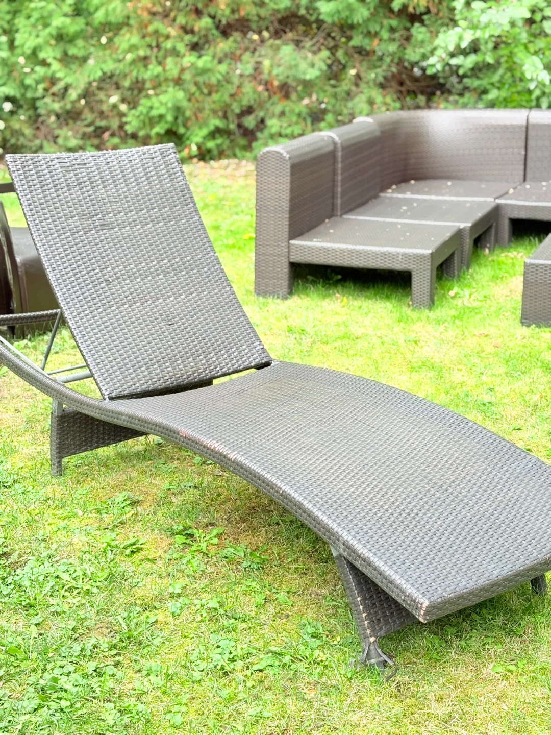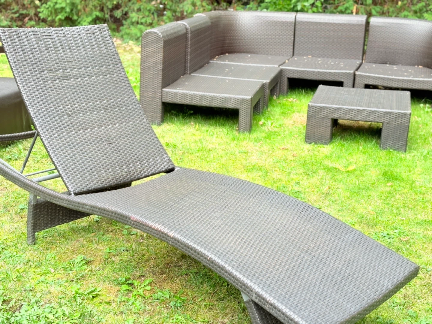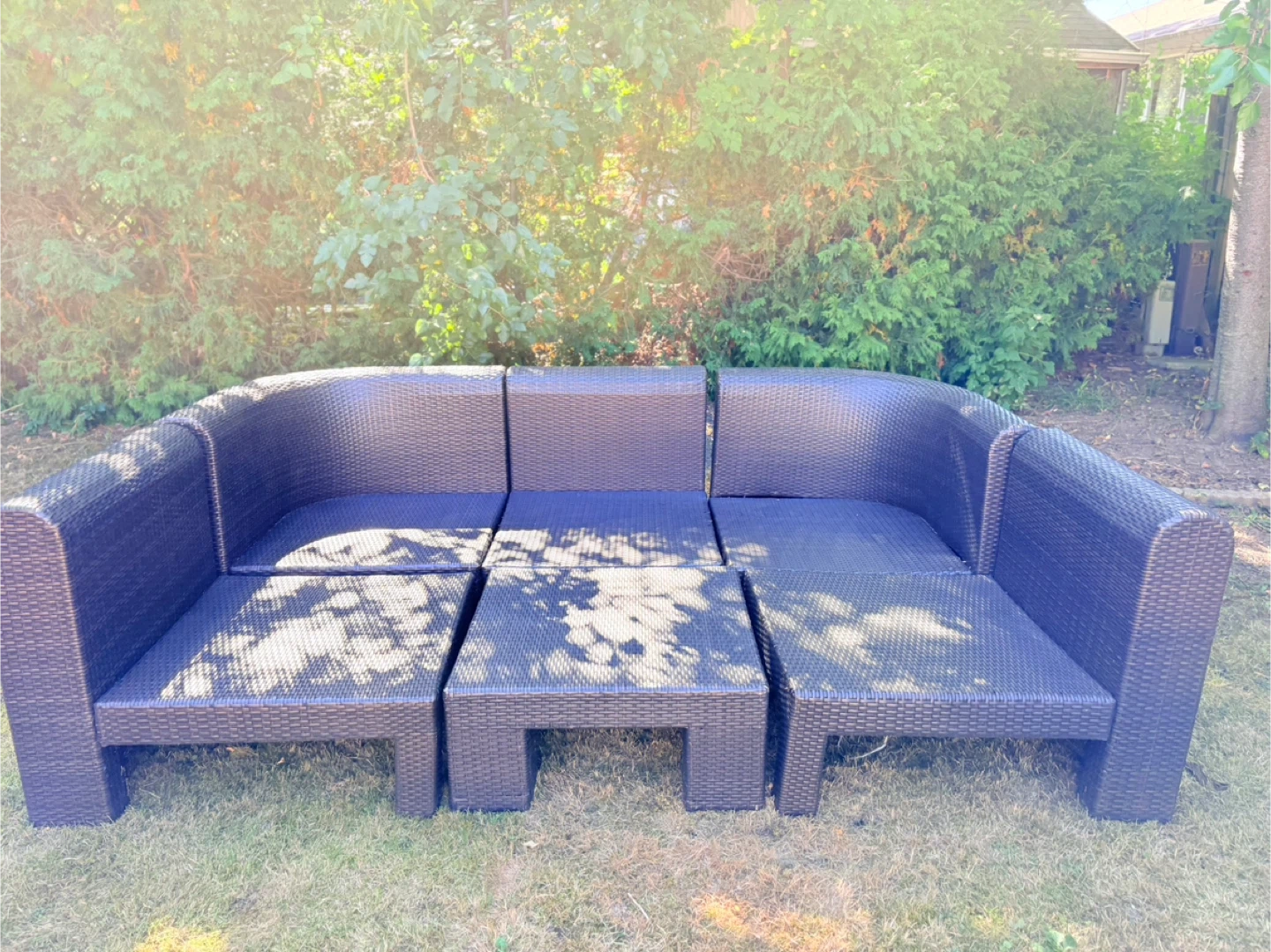 Outdoor wicker lounge set in brown. Includes a sectional sofa, coffee table, and lounge chair. Perfect for enjoying the summer weather in your backyard