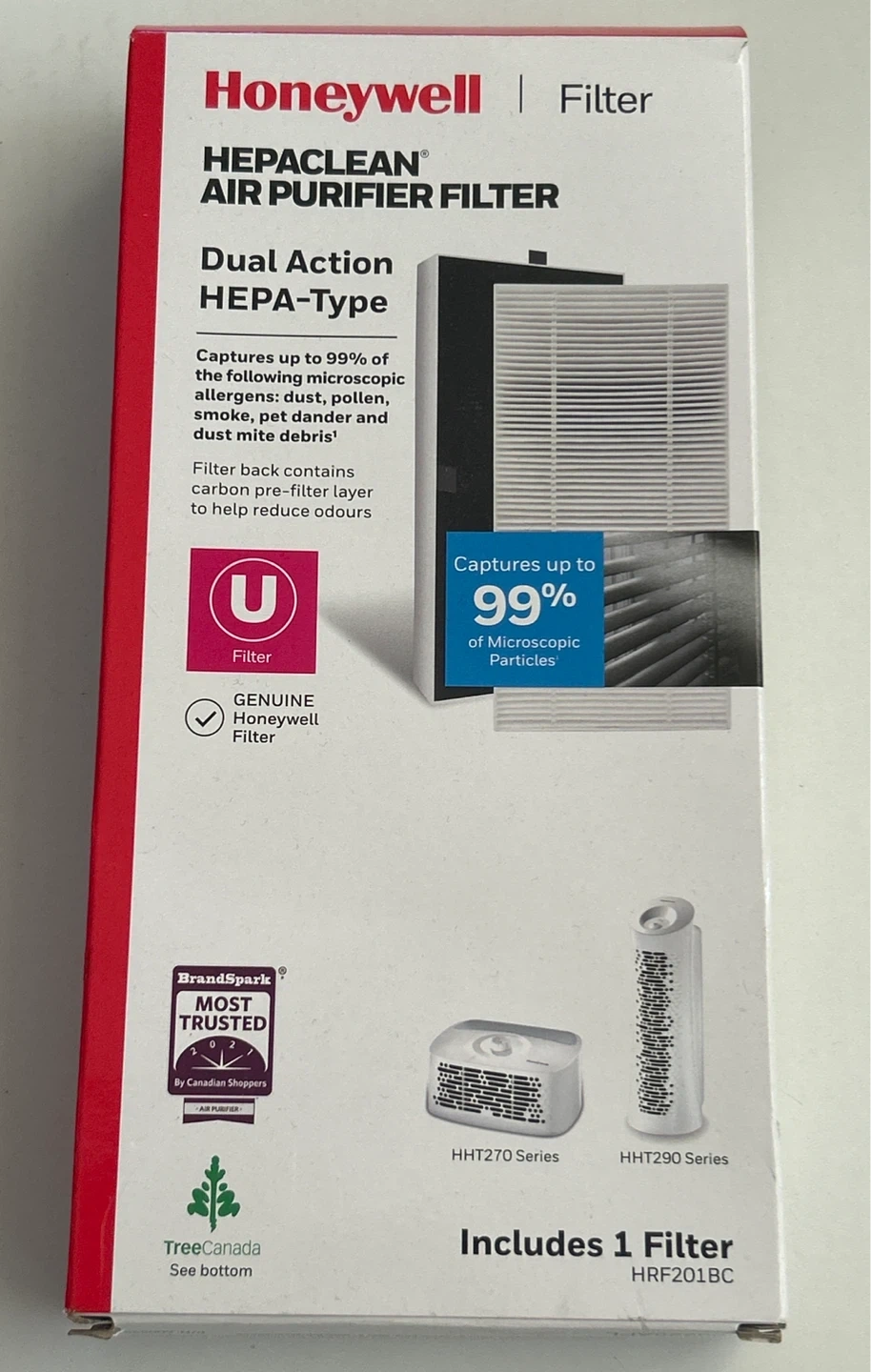 Keep your air purifier running smoothly with this Honeywell Dual Action HEPA-Type Filter! It's designed for the HHT270 and HHT290 models. This filter captures up to 99% of microscopic particles like dust, pollen, smoke, pet dander, and dust mite debris. The filter back contains a carbon pre-filter layer to help reduce odours. Includes 1 filter, HRF201BC.