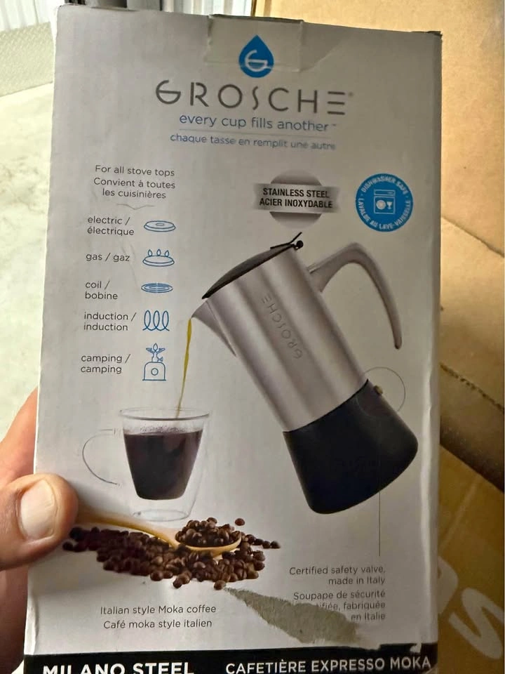 Enjoy café-quality espresso at home with this premium stovetop espresso maker. Crafted from durable 18/8 stainless steel, it works seamlessly on induction, gas, electric, glass, and propane stovetops. Built to last, it features a heat-resistant silicone handle and a European safety valve for safe, reliable brewing.