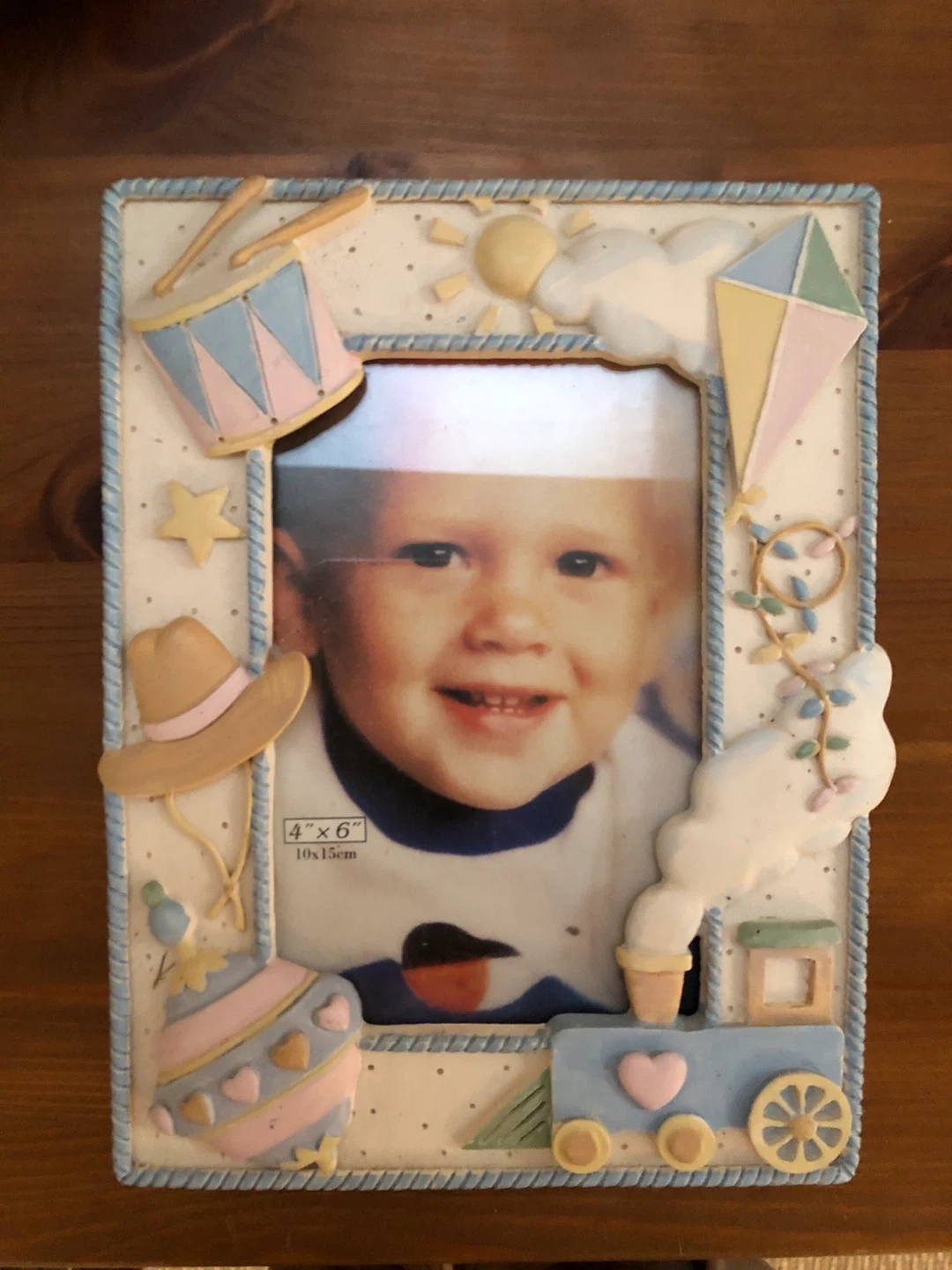 Here's a cute baby picture frame that holds a 4"x6" photo. It has adorable decorations like a drum, kite, hat, and train. It's in good condition and ready to display your favourite baby photo