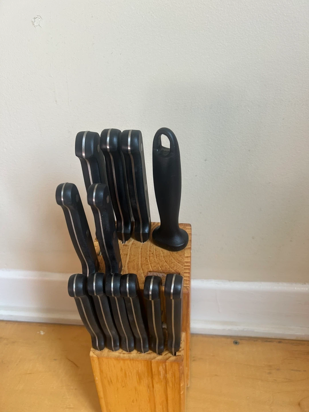 Selling a knife set that comes with a wooden block. The knives have black handles and are in good condition. The block is a light wood colour. Great for any kitchen!