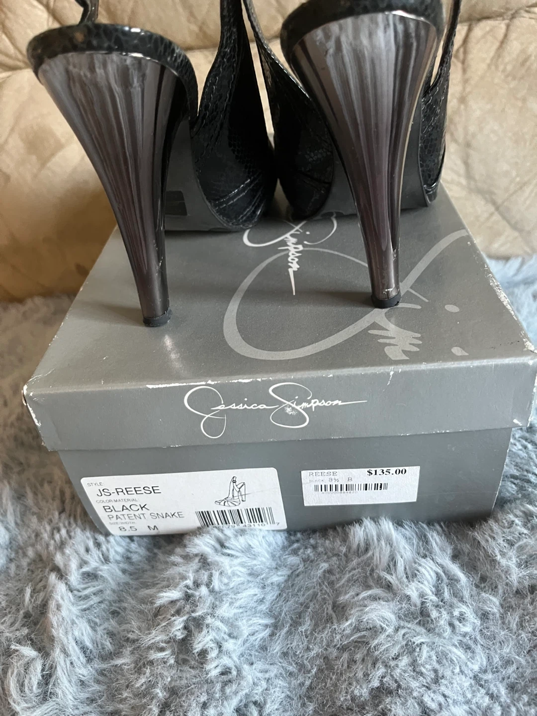 Selling a pair of Jessica Simpson "Reese" heels in black patent snake. They are a size 8.5M and come with the original box. These stylish heels originally retailed for $135.00!