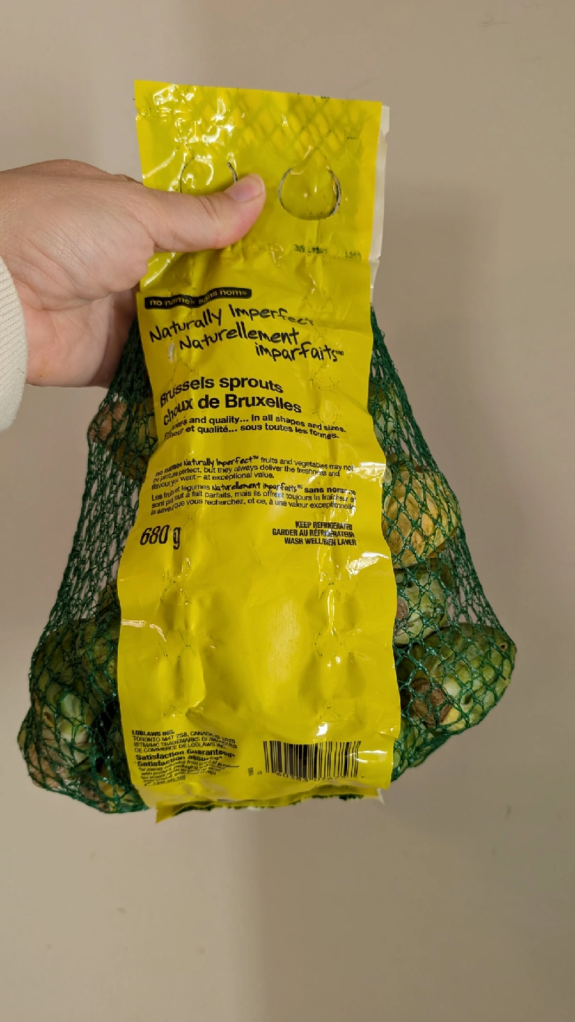 bag of Naturally Imperfect Brussels Sprouts, weighing 680g. These sprouts are in all shapes and sizes, offering good taste and quality. Perfect for a healthy meal!