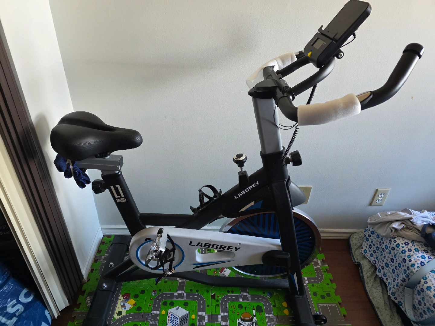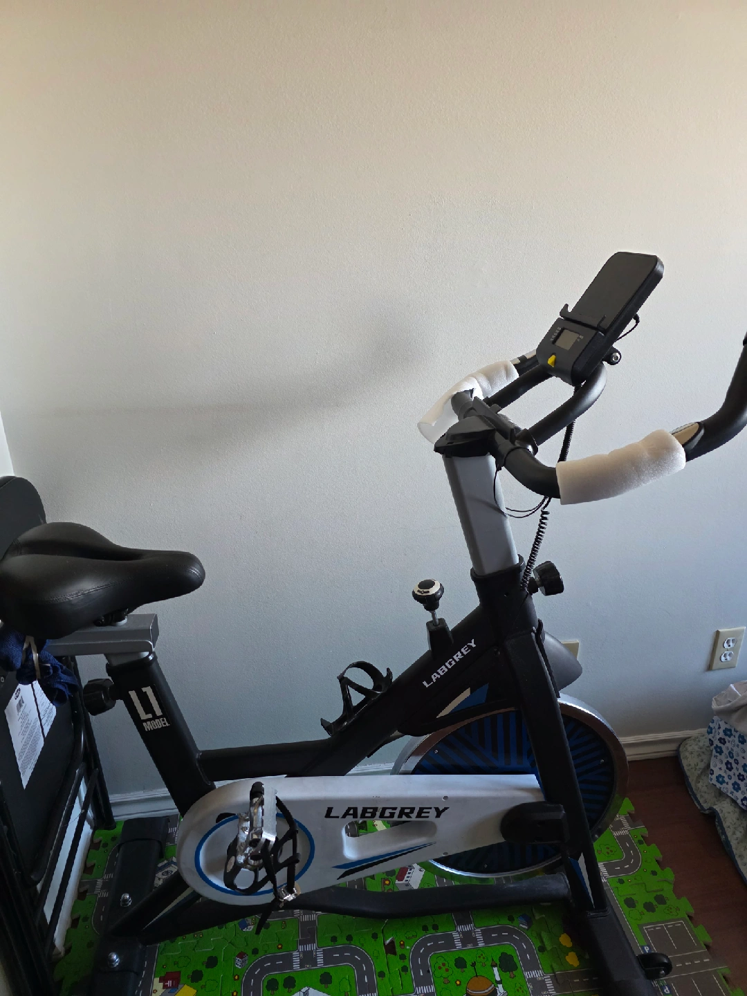 Get your sweat on with this LABGREY L1 indoor exercise bike! It's in great shape and ready for a new home gym. The bike features a display to track your time, distance, and calories burned. Perfect for staying active indoors!