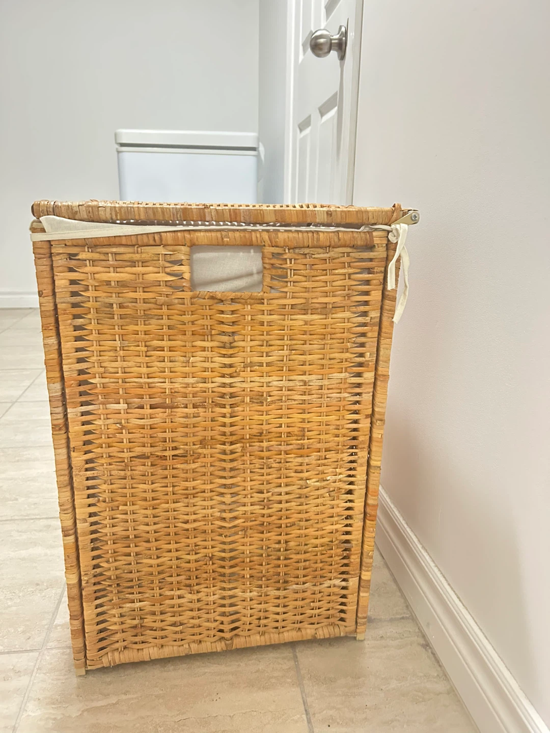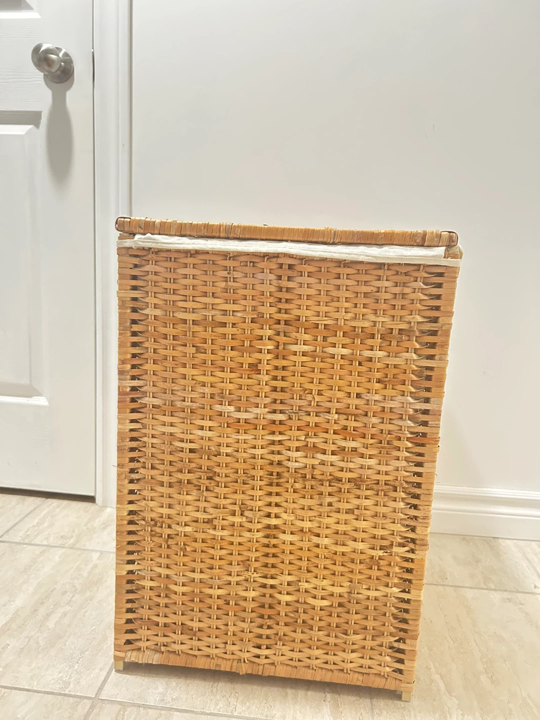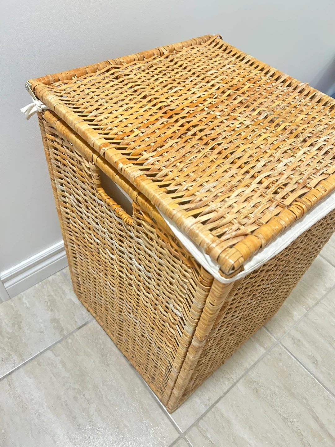 Gently used laundry hamper with a lid. It's in great shape and ready to help keep your laundry organized. The hamper has a removable fabric liner, making it easy to clean. It is made of a natural wicker material. The lid, which is easy to open with a single hand, hides your dirty laundry out of sight, helps contain unpleasant smells, and keeps your pets out of the laundry