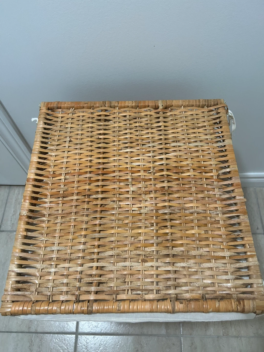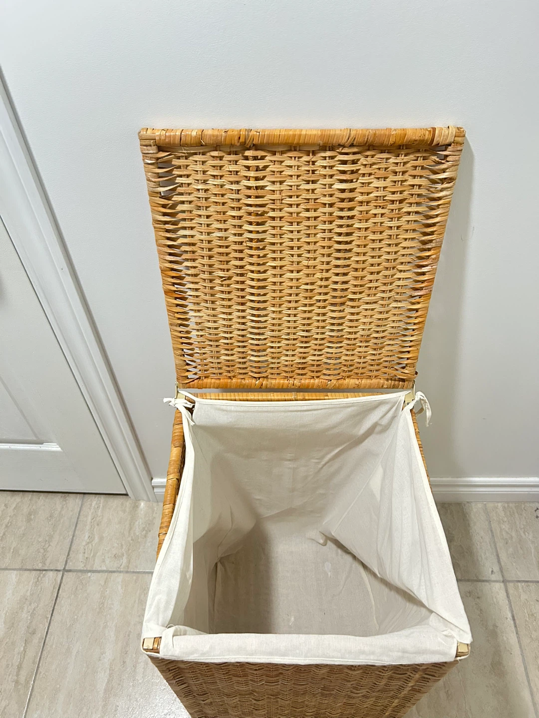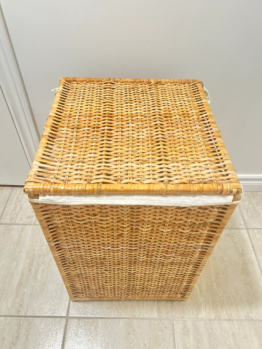 Gently used laundry hamper with a lid. It's in great shape and ready to help keep your laundry organized. The hamper has a removable fabric liner, making it easy to clean. It is made of a natural wicker material. The lid, which is easy to open with a single hand, hides your dirty laundry out of sight, helps contain unpleasant smells, and keeps your pets out of the laundry