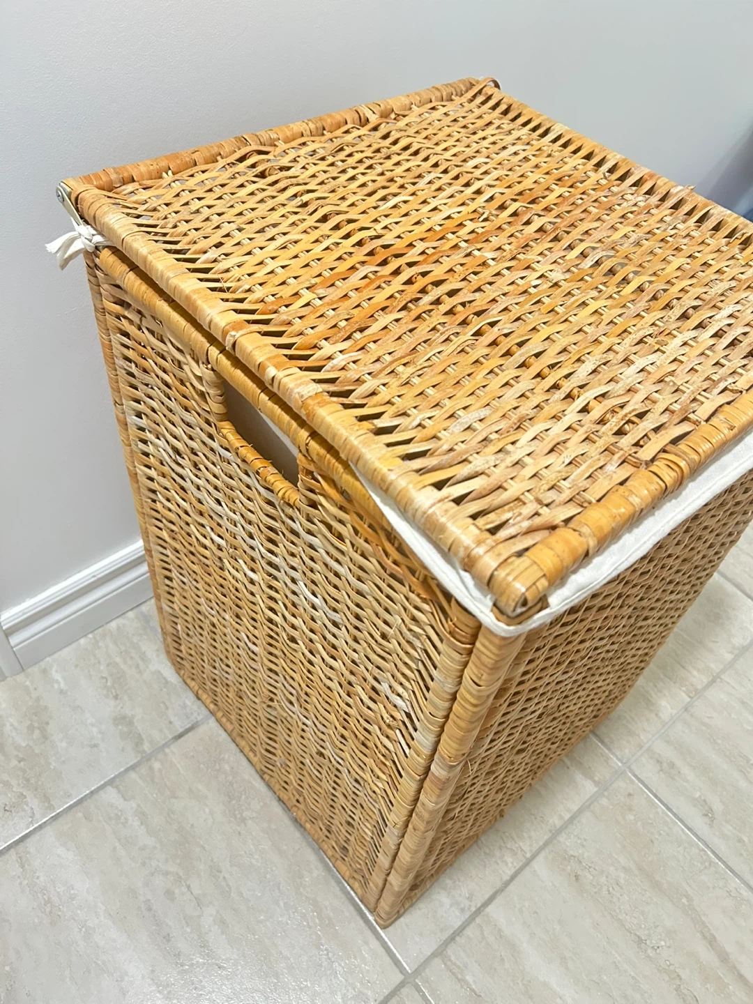 147Gently used laundry hamper with a lid. It's in great shape and ready to help keep your laundry organized. The hamper has a removable fabric liner, making it easy to clean. It is made of a natural wicker material. The lid, which is easy to open with a single hand, hides your dirty laundry out of sight, helps contain unpleasant smells, and keeps your pets out of the laundry