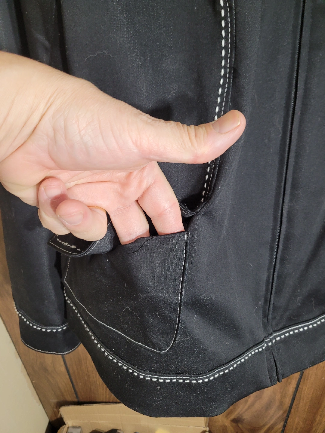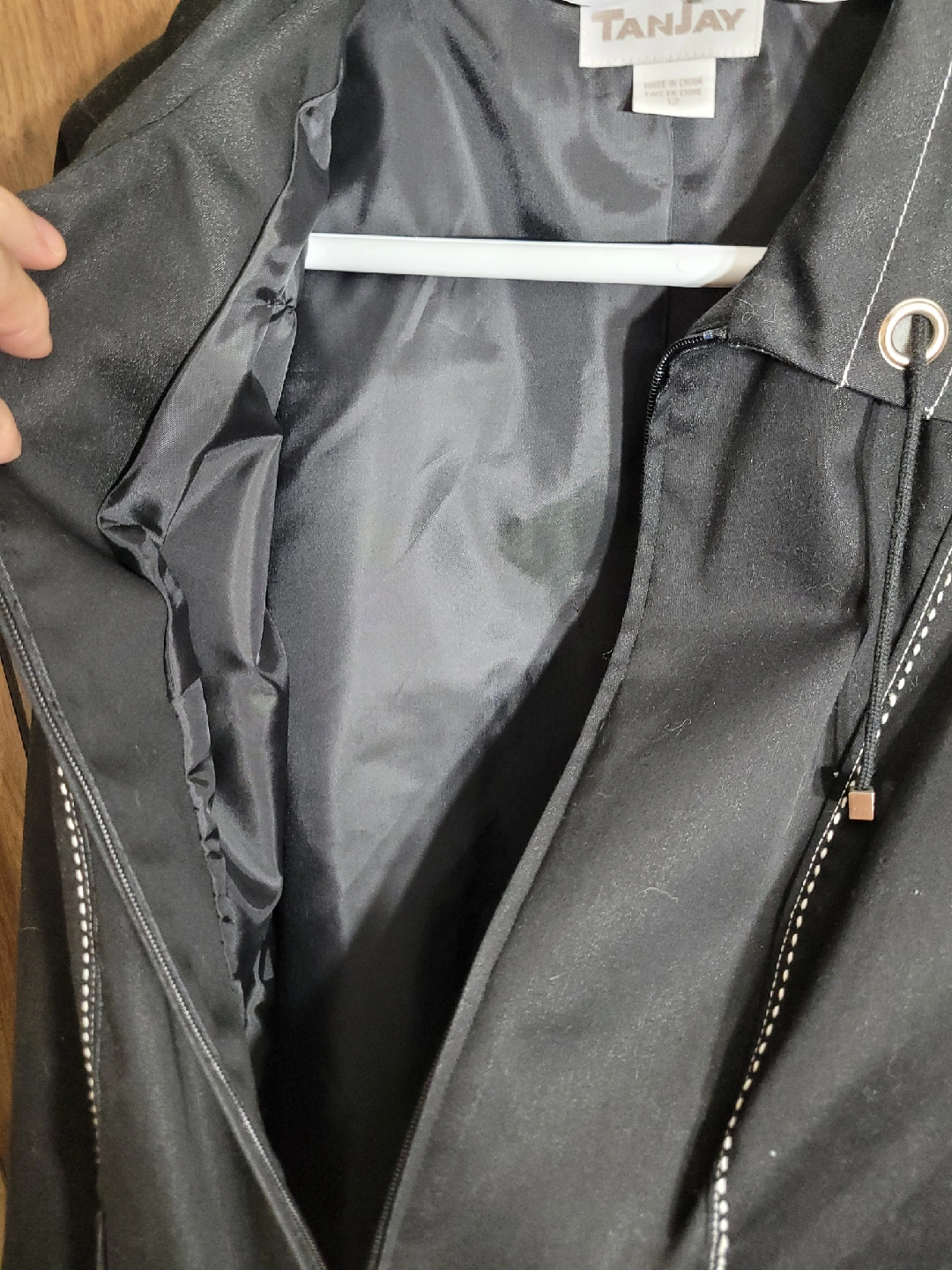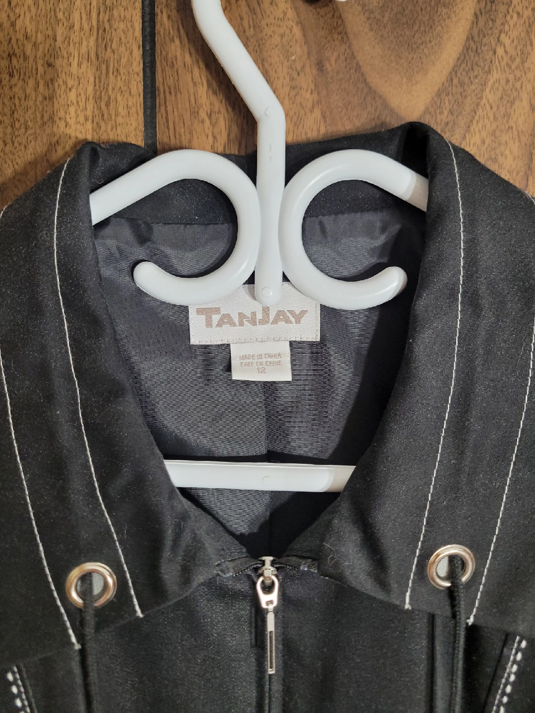 197Selling a gently used Tanjay jacket in size 12. It's black with white stitching and has a zipper closure. Perfect for layering!